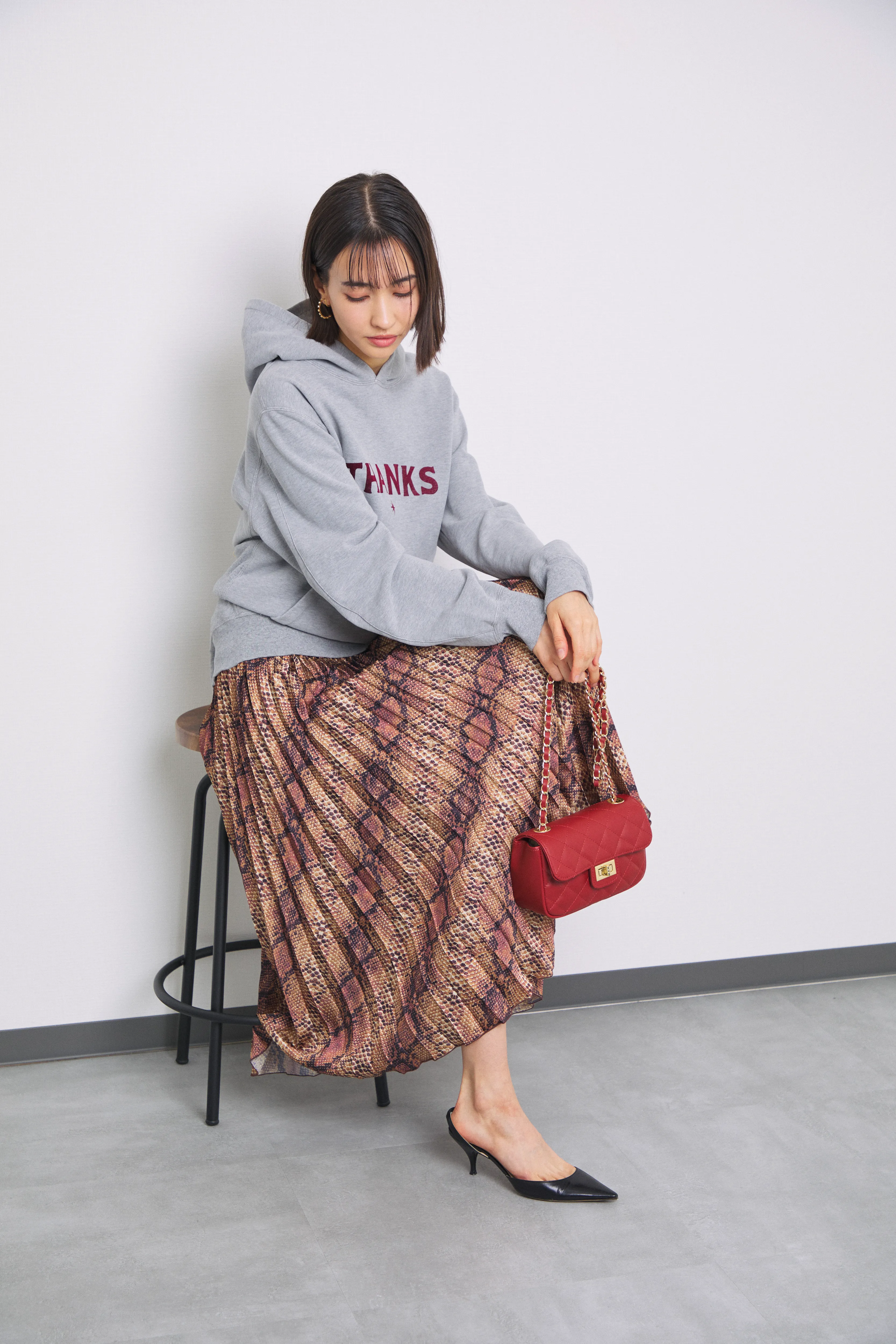 インパクトのあるパイソンプリントのアコーディオンプリーツスカートを主役にした、大人のカジュアルコーデ。ロゴ入りのオーバーサイズパーカーを合わせてラフさをプラスしつつ、足元にはポインテッドトゥのミュール、バッグにはチェーン付きのキルティングデザインを選んで、上品さをしっかりキープ。カジュアルだけど品よくまとまる、大人の女性にぴったりなメリハリのあるスタイリングです。