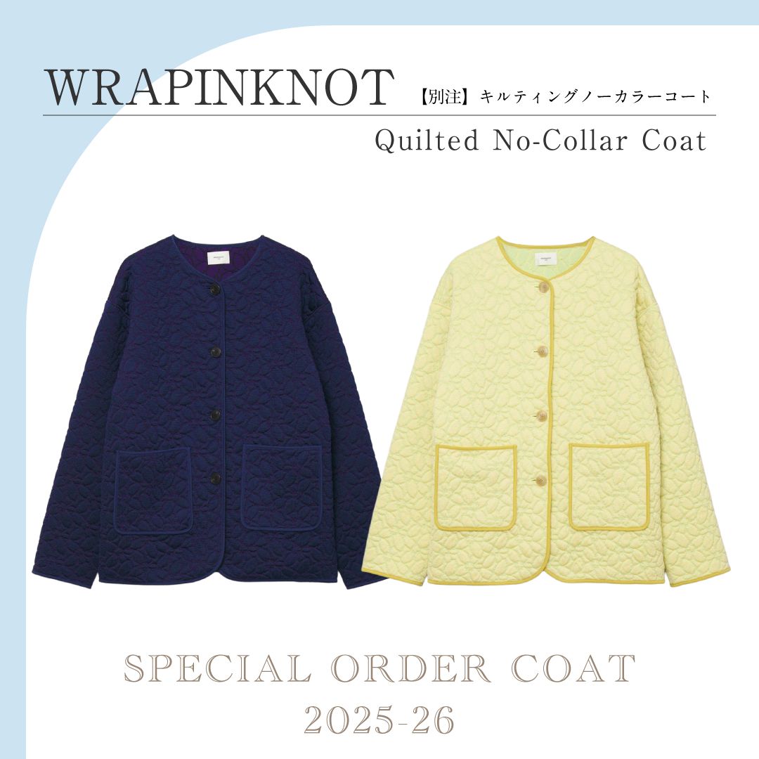 ラッピンノット(WRAPINKNOT)にオーダーしたキルティングコートは、2025年秋冬の新作をベースに、ボタンや生地・ステッチ糸・パイピングの色にこだわった特別な1着。カラーは、フレッシュなライムイエローとシックなネイビーの2色展開です。