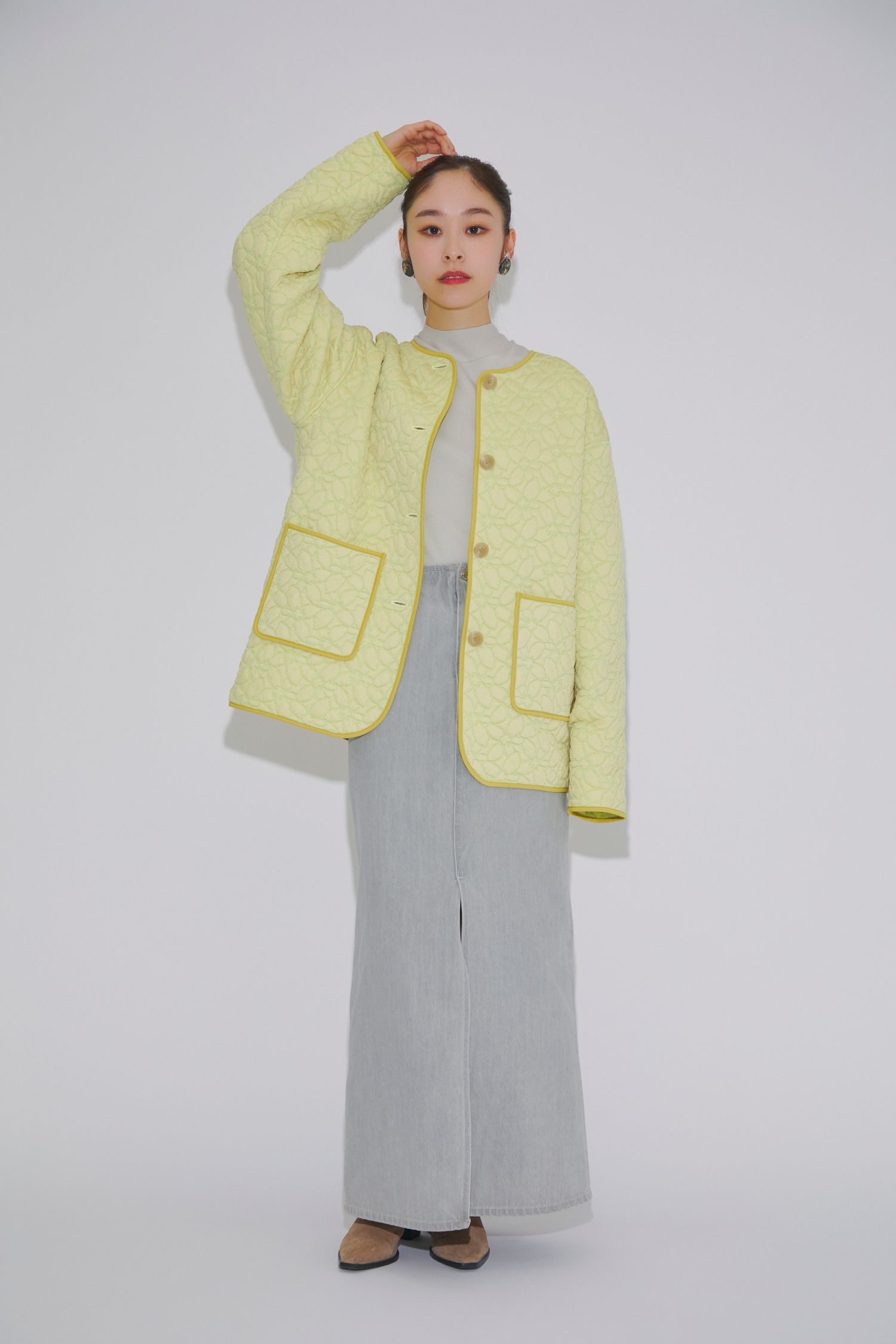 淡いグレーのワンカラーコーデにイエローのキルティングコートを羽織れば、ぐっと春らしく新鮮な印象に。イエローの柔らかい色合いに合わせてまろやかなニュアンストーンでまとめることで、品よくおしゃれな着こなしに仕上がります。