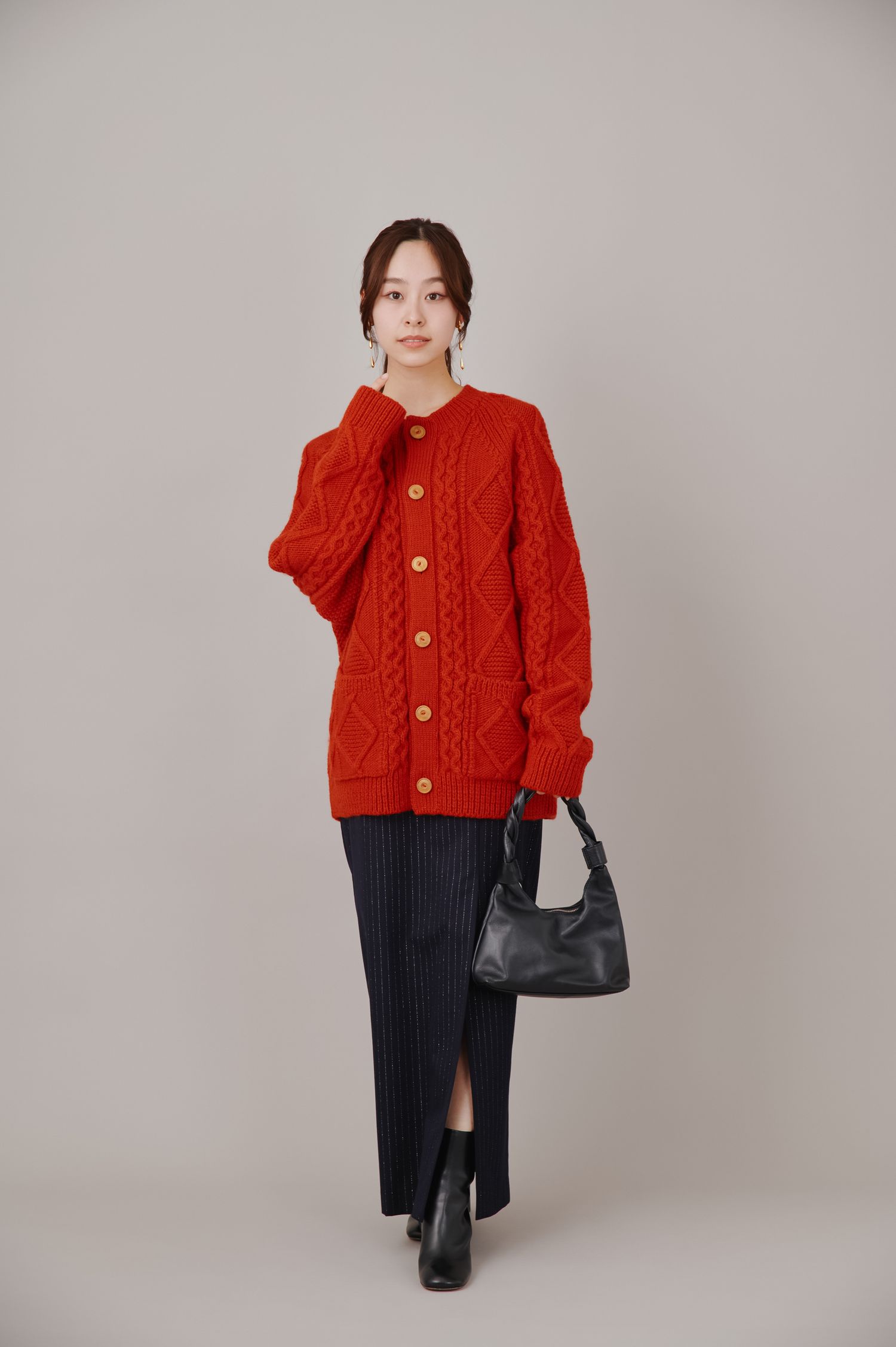 鮮やかなオレンジのアランニットカーディガンを主役に、全体をすっきりとまとめた大人のカジュアルコーデ。Iラインスカートとレザーバッグでシャープさを添えることで、ニットのほっこり感を軽減し、大人っぽくモダンな印象に仕上げました。
