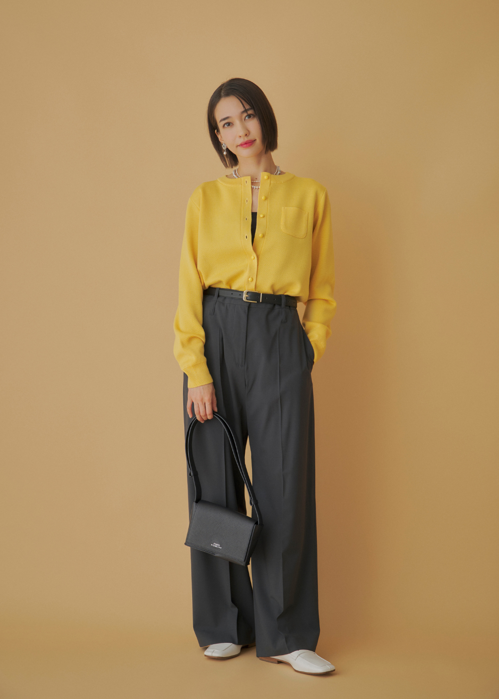 イエローのカーディガンには、グレーのワイドパンツを合わせてスタイリッシュな佇まいに。気持ちまで明るくなるような鮮やかカラーが、冬の装いをぐっと華やかにアップデートしてくれます。パールネックレスとイヤリングを添えれば、一層洗練された雰囲気に。