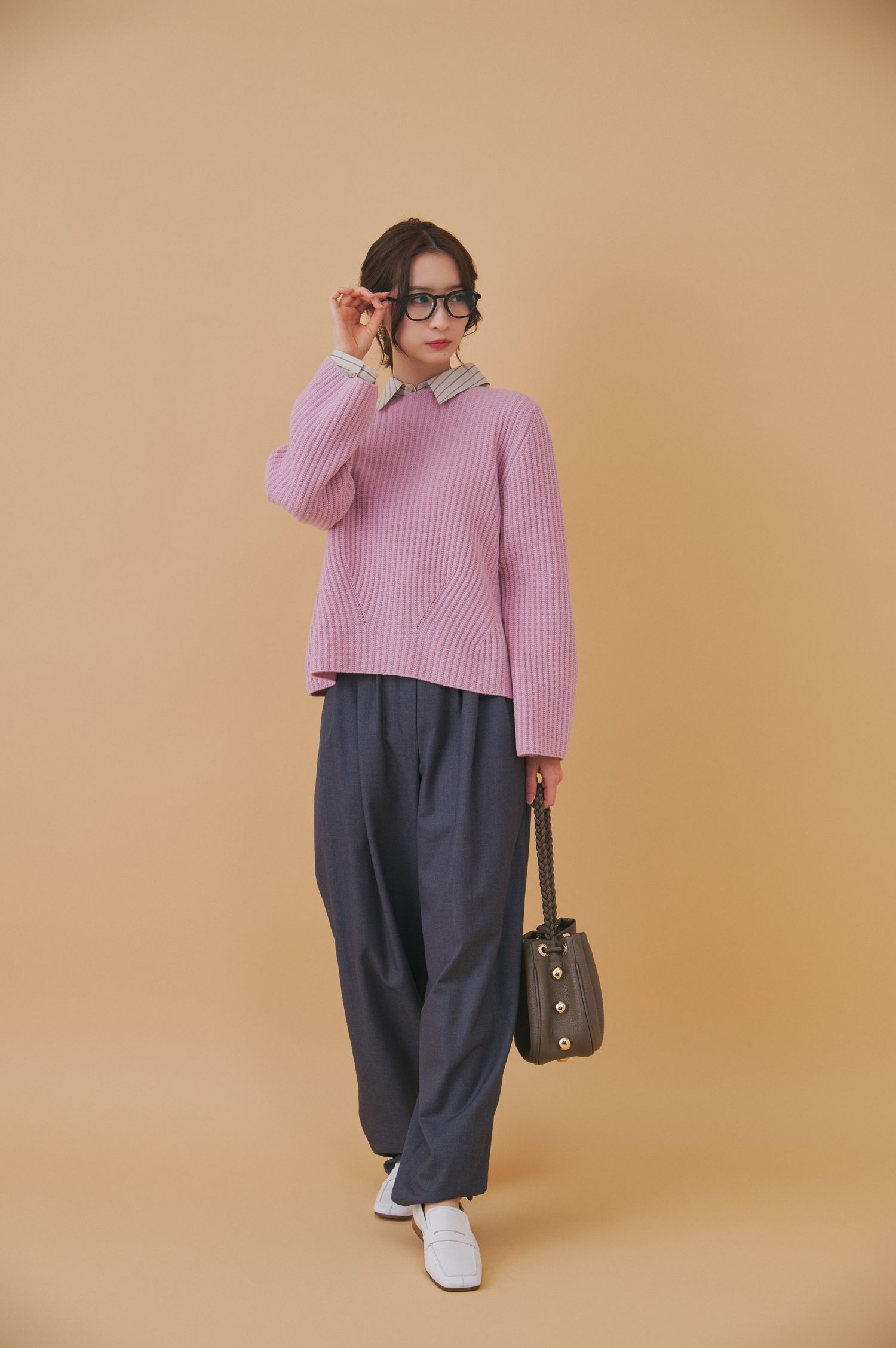 愛らしいピンクニットは、首元にシャツを覗かせてグレーのタックパンツを合わせれば、フェミニン×マニッシュの絶妙なミックス感を楽しめます。メガネやローファーなど、トラッドな小物をプラスして凛としたムードに仕上げて。