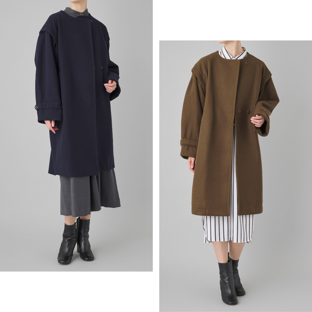 レリル(lelill)の別注コートは、程よくゆとりのあるシルエット×すっきりとしたノーカラーで、オンオフ問わず活躍する万能アウター。ウール・アクリル・ナイロンを混紡した「テックメルトン」素材で、ウール100%よりも軽くて暖かいのが魅力です。