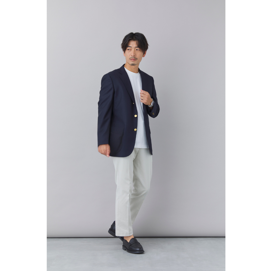 年齢にふさわしい品格と、余裕のある着こなしが求められる40~50代には、クラシカルなネイビーのブレザーが好相性。ブルックスブラザーズ(Brooks Brothers)の紺ブレは、着るだけで気品が漂い、大人男性に寄り添う1着です。インナーはシャツではなく、あえてカットソーにすることで、抜け感を演出。カジュアルレストランからホテルのラウンジまで、幅広い会場に対応できる同窓会コーデです。
