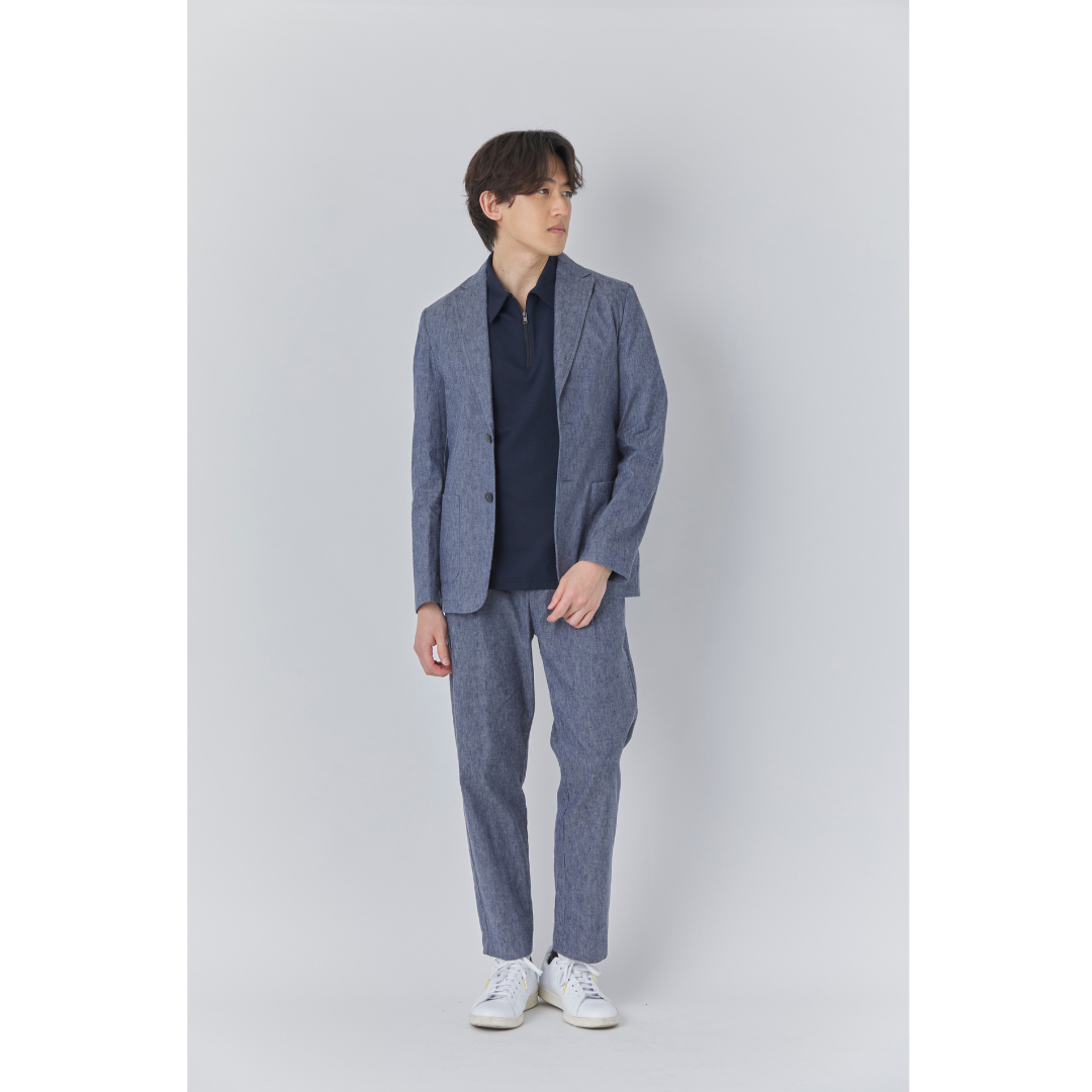ティージャケット ウオモ(T-JK UOMO)のセットアップは、コットンリネンの涼しげな素材なので、少し蒸しばむ春夏にもおすすめ。ラフな質感でも落ち着いたカラーと、インナーのポロシャツのおかげで、上品に仕上がります。足元は軽やかな白スニーカーを合わせて、抜け感を演出。