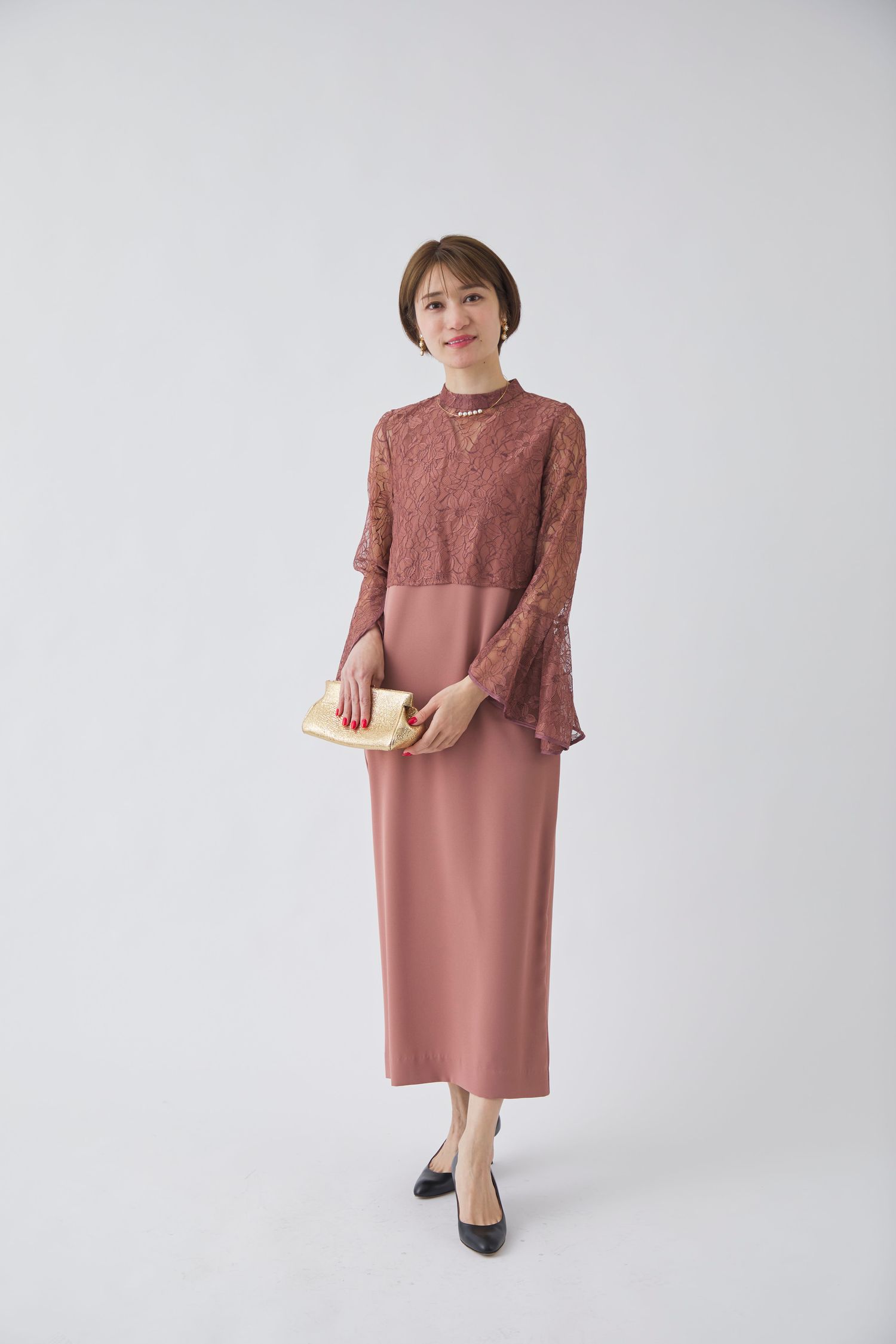 大人っぽさを演出するなら、くすみカラーのドレスも選ぶのも◎。すっきりとしたIラインシルエットと繊細なラッセルレースが上品なエメ(AIMER)のドレスなら、立ち姿まで美しく見せてくれます。温かみのあるドレスの色味に合わせてアクセサリーやバッグはゴールドで統一すれば、大人の品を感じさせるシックな装いに。