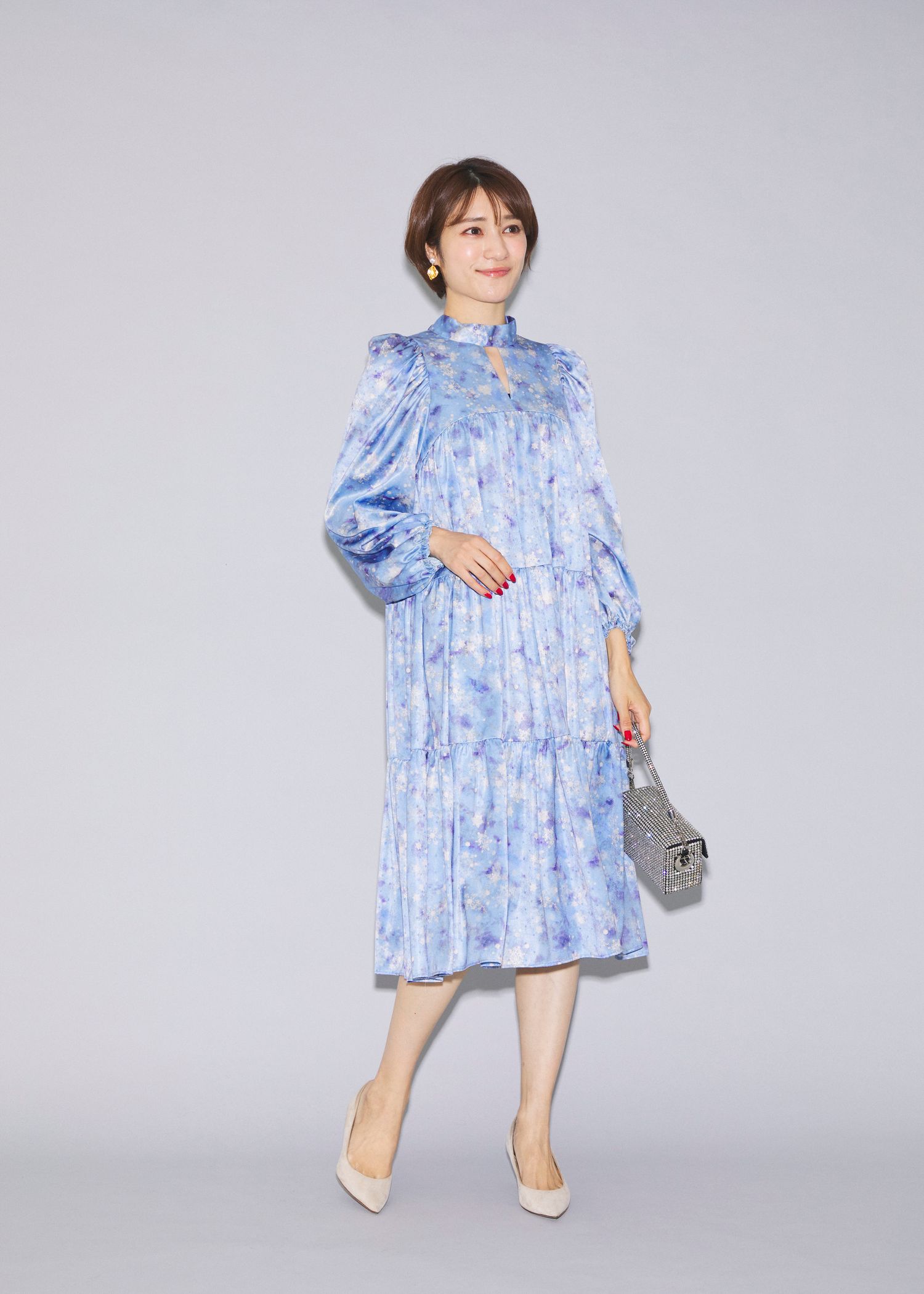 淡いブルーに花柄が広がるティアードドレスは、動くたびに揺れて可憐さが際立つ一着。ふんわり袖とハイネックのデザインが、どこかクラシカルで愛らしいムードを漂わせます。仕上げにはドレスの煌めきと呼応する、ジアライト(Giarite)のラインストーンバッグを合わせて。