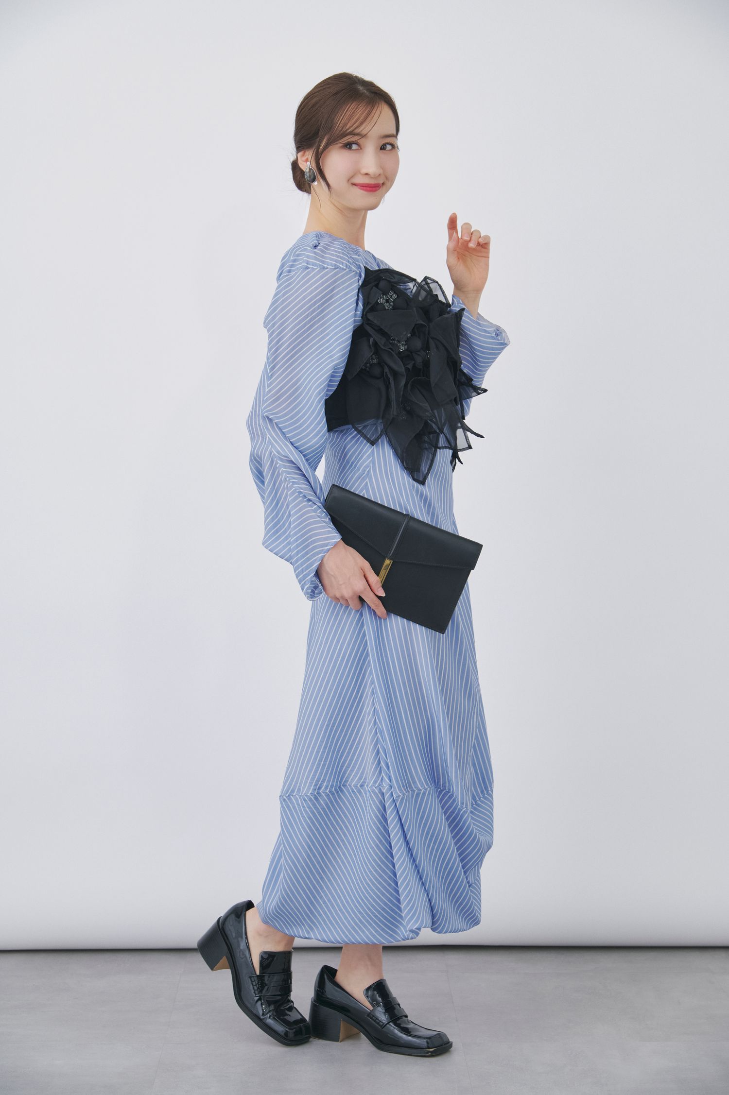 同窓会コーデをクールに仕上げるなら、あえて“ザ・パーティードレス”ではないデザインを選ぶのも◎。クラネ(CLANE)のストライプ柄ワンピースは、マニッシュなムードと女性らしさが共存する1枚。広がりを抑えたロング丈や袖口の長めのスリットが、モダンな印象をプラスします。仕上げにシルバーのイヤリングをつけて、さりげない華やかさも添えて。
