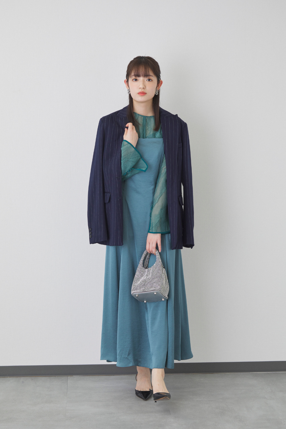 シアートップスに、やわらかな光沢感が美しいキャミソールワンピースを重ねれば、頑張りすぎないこなれたドレスアップスタイルに。さらにジャケットを羽織れば、全体がキリッと整い、甘さを控えた大人のムードが漂います。アクセサリーやラインストーンバッグで輝きを添えれば、同窓会にぴったりの華やかさもキープできます。