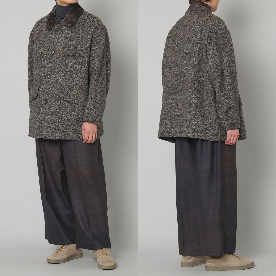 ウールならではの温もりある素材感に、程よくゆとりのあるシルエットが、クラシックでありながらも肩肘張らない雰囲気を演出。襟元には異素材をあしらい、さりげなく表情に変化をつけています。柄物でありながら主張しすぎず、きれいめなパンツからカジュアルなデニムまで幅広く合わせられるのが魅力です。