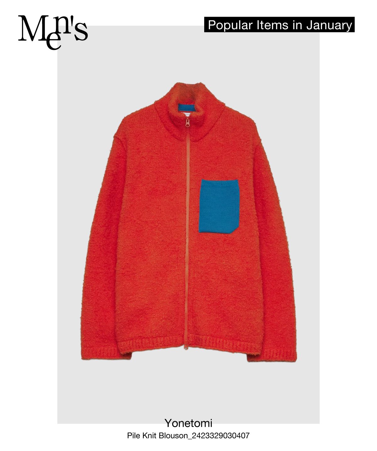 はじめにご紹介するのは、鮮やかな赤色が目を惹くヨネトミ(Yonetomi)のニットブルゾン。暗くなりがちな冬の装いに1点投入するだけで、コーディネートに華やかさを加えてくれます。