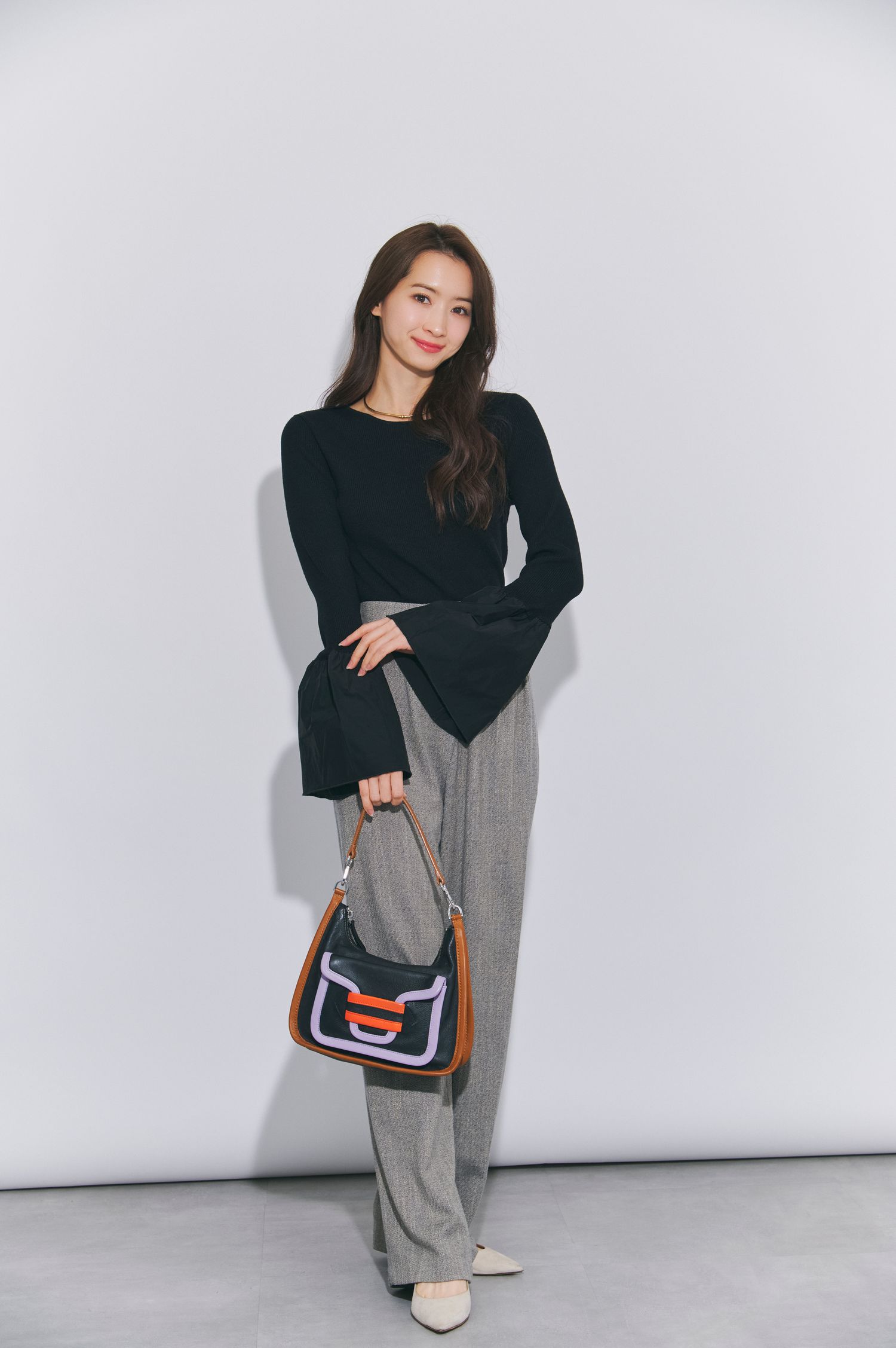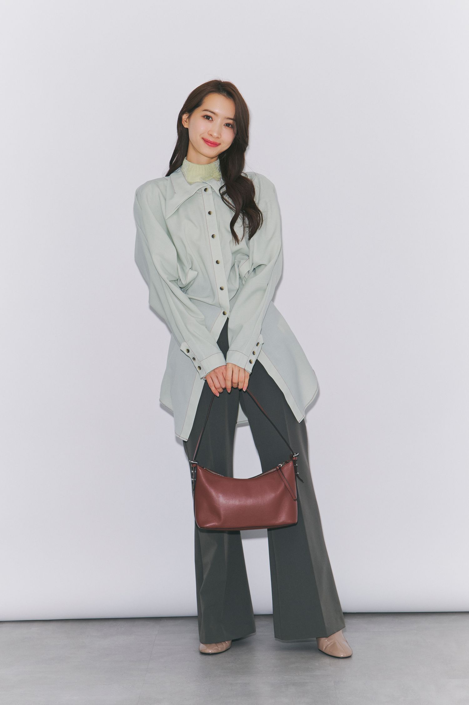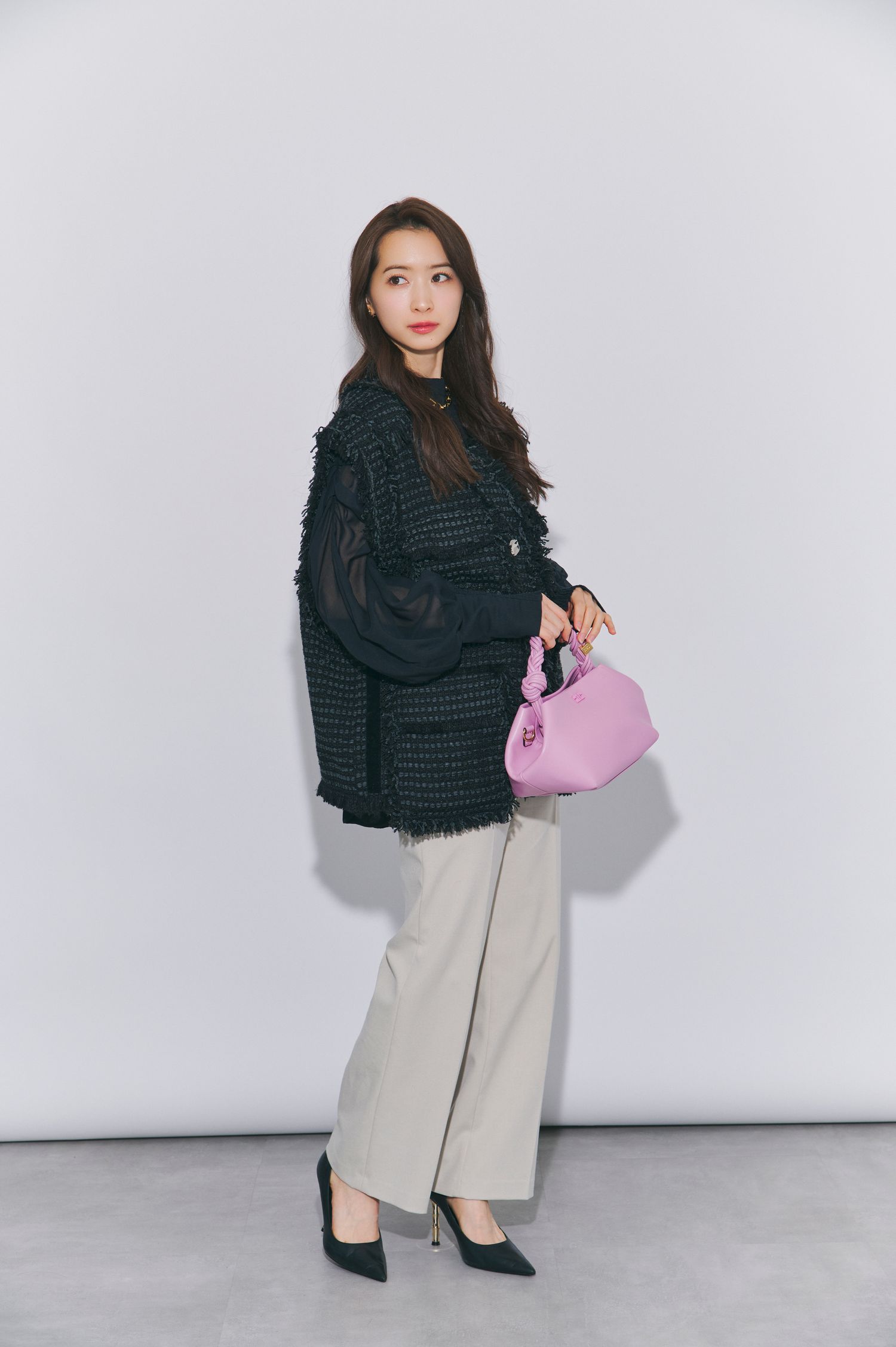 合わせるのは、落ち感がきれいなパンツと、コーディネートのアクセントになる発色の良いバッグ。職場にフィットする上品さを保ちながら、ほどよく洒落感をプラスしてくれる組み合わせで、仕事帰りの集まりにも気負わず“きちんとおしゃれ”を楽しめます。