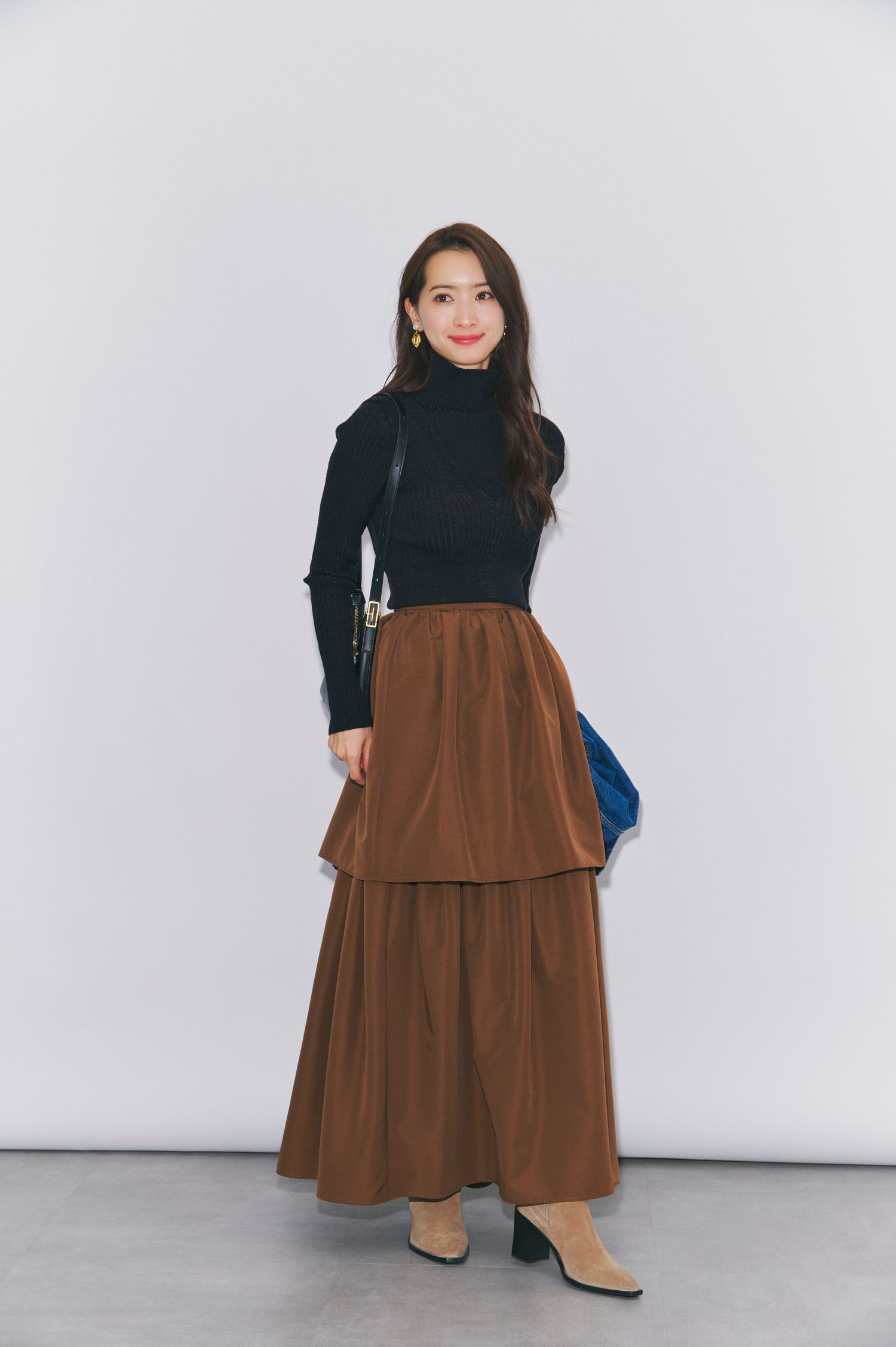 ハリ感のある生地を重ねたドラマチックなフリルスカートが、女子会にぴったりの特別感を演出。加えて、2025年秋冬のトレンドでもあるブラウンを選ぶことで、感度の高さもアピールできます。