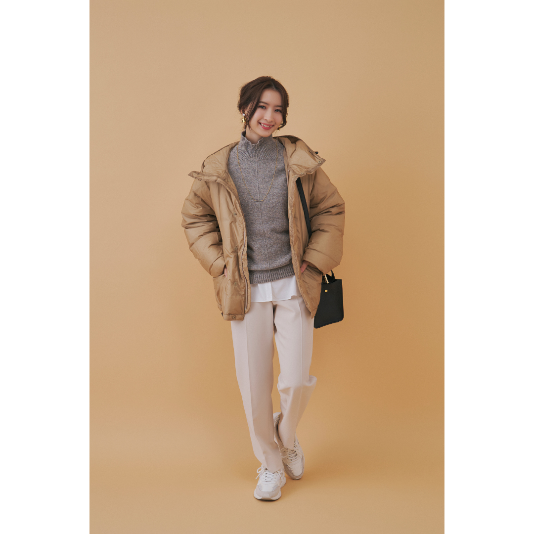 とにかく時間との勝負になる朝の子どもの送迎には、サッと羽織れてサマになるアウターが強い味方。レミレリーフ(REMI RELIEF)のダウンジャケットは、光沢感のある上品なベージュカラーで、すっきりとした短丈が特徴。自転車での送迎の際にも使いやすく、軽くて暖かいのもうれしいポイントです。