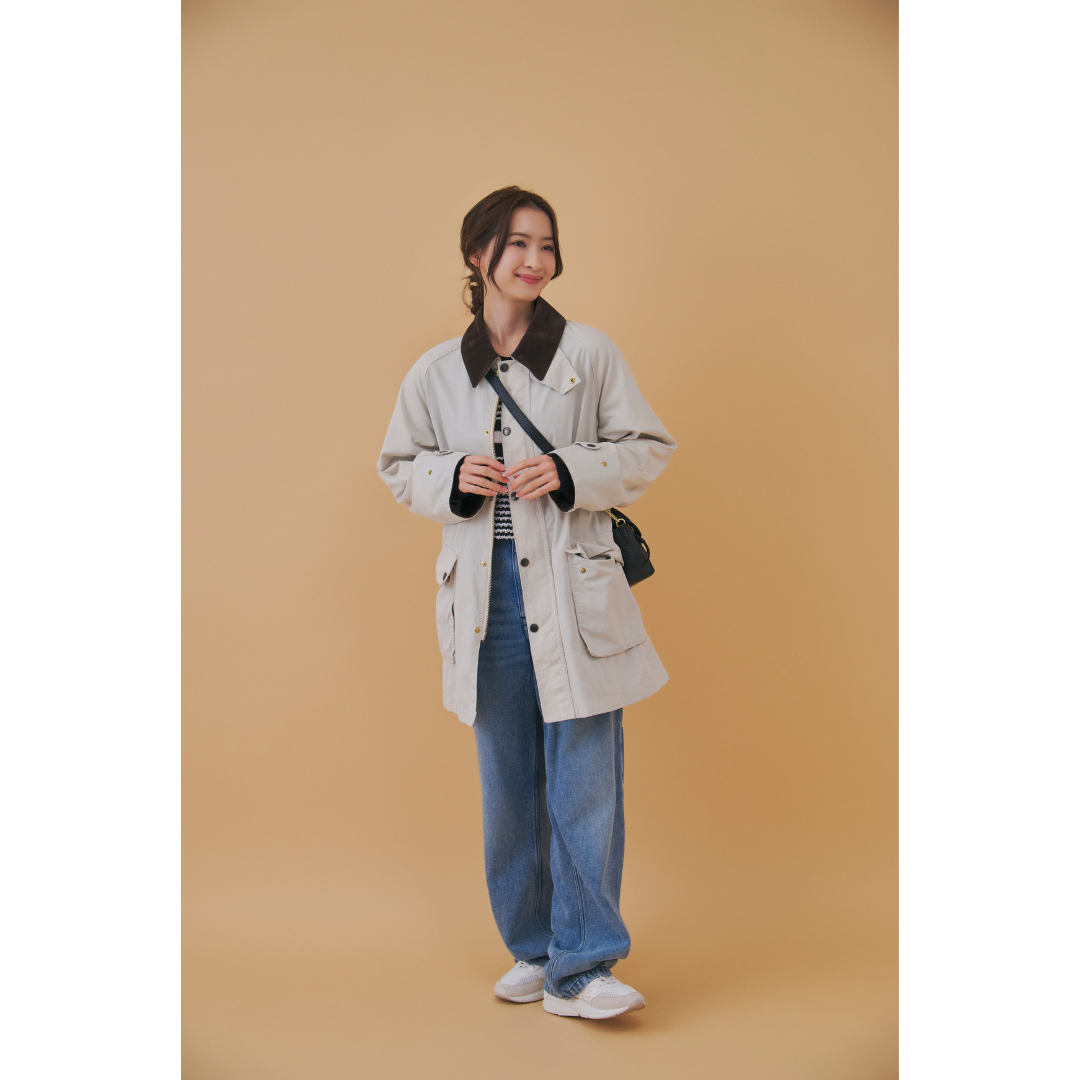 手持ちのミリタリージャケットは、コーディネートのアクセントになりつつ、移動中や旅先での気温差にも対応できる頼れる1枚。小物にはシルバーのミニバッグで上品さを添え、足元は白スニーカーで軽やかに仕上げれば、子連れでの観光や散策も安心して楽しめるママコーデに。