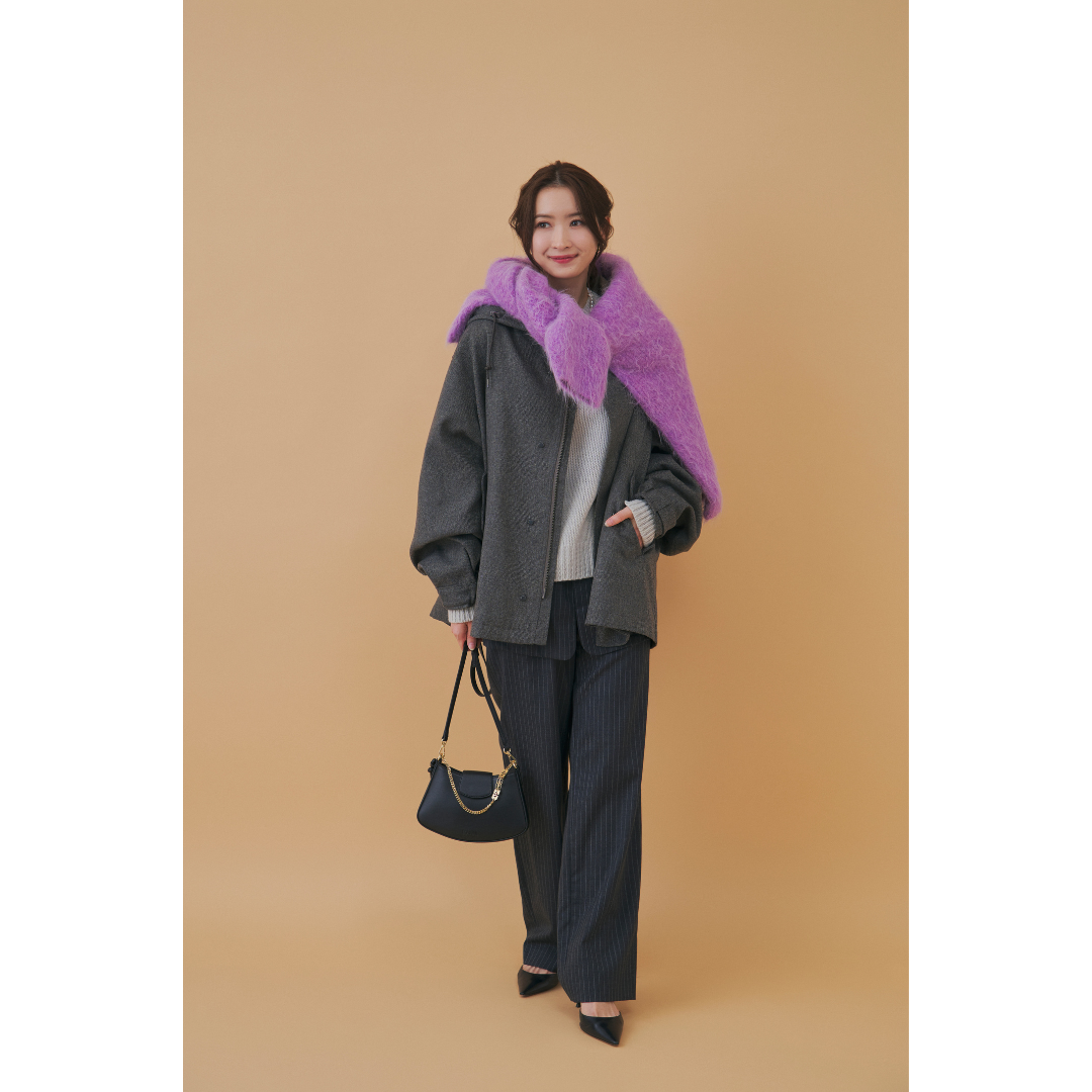 ママ友とのランチでは、カジュアルすぎず、でも気取りすぎないバランスが大切。きれいめ見えするニットに、デザイン性のあるレイヤードパンツを合わせれば、親しみやすさとこなれ感を両立できます。アウターには同系色のグレーのツイードブルゾンを重ねて、全体のトーンを揃えることで上品さを演出。さらに、肩にかけたパープルのニットをマフラー風に巻けば、コーディネートに華やぎがプラスされます。