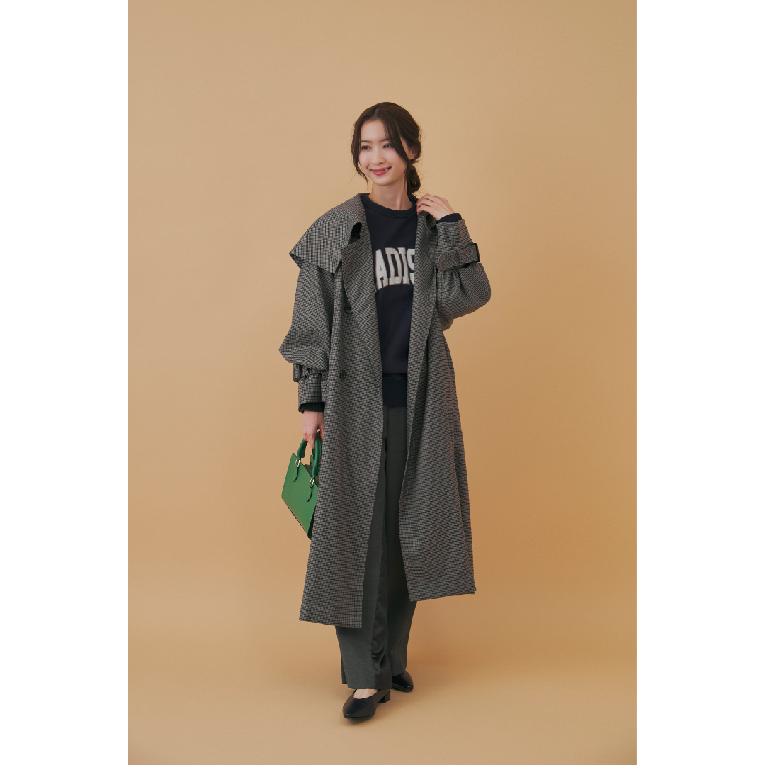 週末の家族でのお出かけは、動きやすさはもちろん、写真映えするおしゃれも叶えたいところ。主役は、ファーファー(FURFUR)のビッグカラートレンチコート。セーラーカラーのようなデザインがフェミニンなムードを漂わせつつも、シックなブラウンチェックが上品さを引き立ててくれます。
