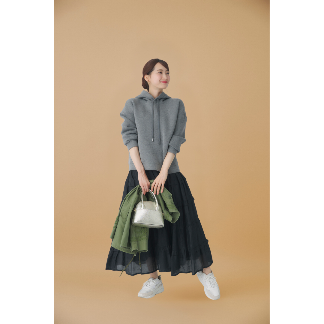 移動時間が長くなる旅行では、快適さとおしゃれの両立がポイント。シワになりにくいパーカーに、フェミニンなティアードスカートを合わせたリラックス感のあるスタイルなら、旅先でも快適に過ごせて、程よいこなれ感も演出できます。
