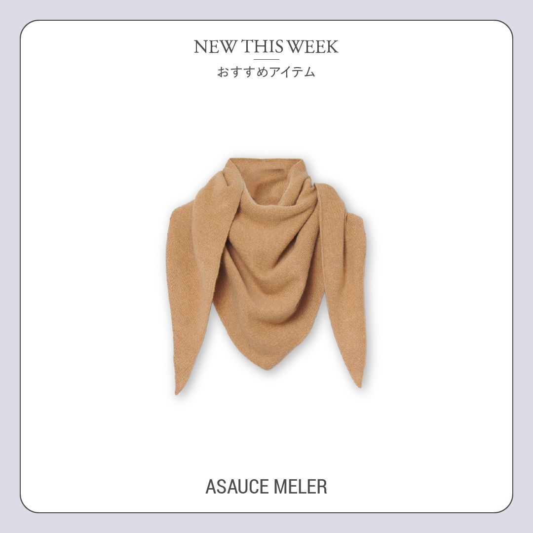 最初にご紹介するのは、アナザーアドレスで新たに取り扱いが始まったカシミヤストールブランド・アソースメレ(ASAUCE MELER)を代表するアイテム。スカーフとストールの魅力を併せ持った、トライアングル型のカシミヤニットストールです。