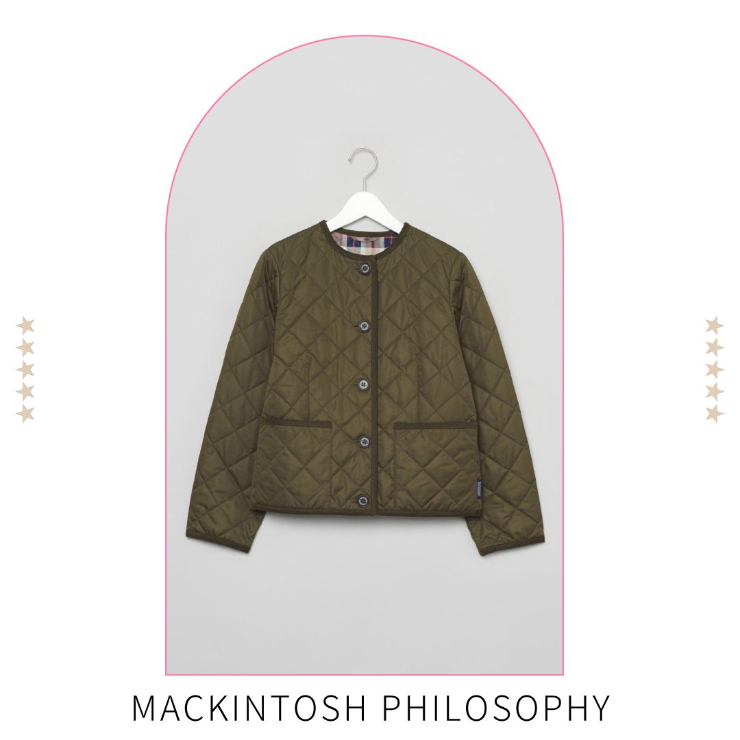 1点目のアイテムは、マッキントッシュ フィロソフィー(MACKINTOSH PHILOSOPHY)のキルティングノーカラーブルゾン。ブラウン寄りのカーキカラーは、ベーシックながらもどこかこなれた雰囲気。着丈もすっきりしているので、デニムやスラックス、スカートまで幅広く合わせやすいのも◎。