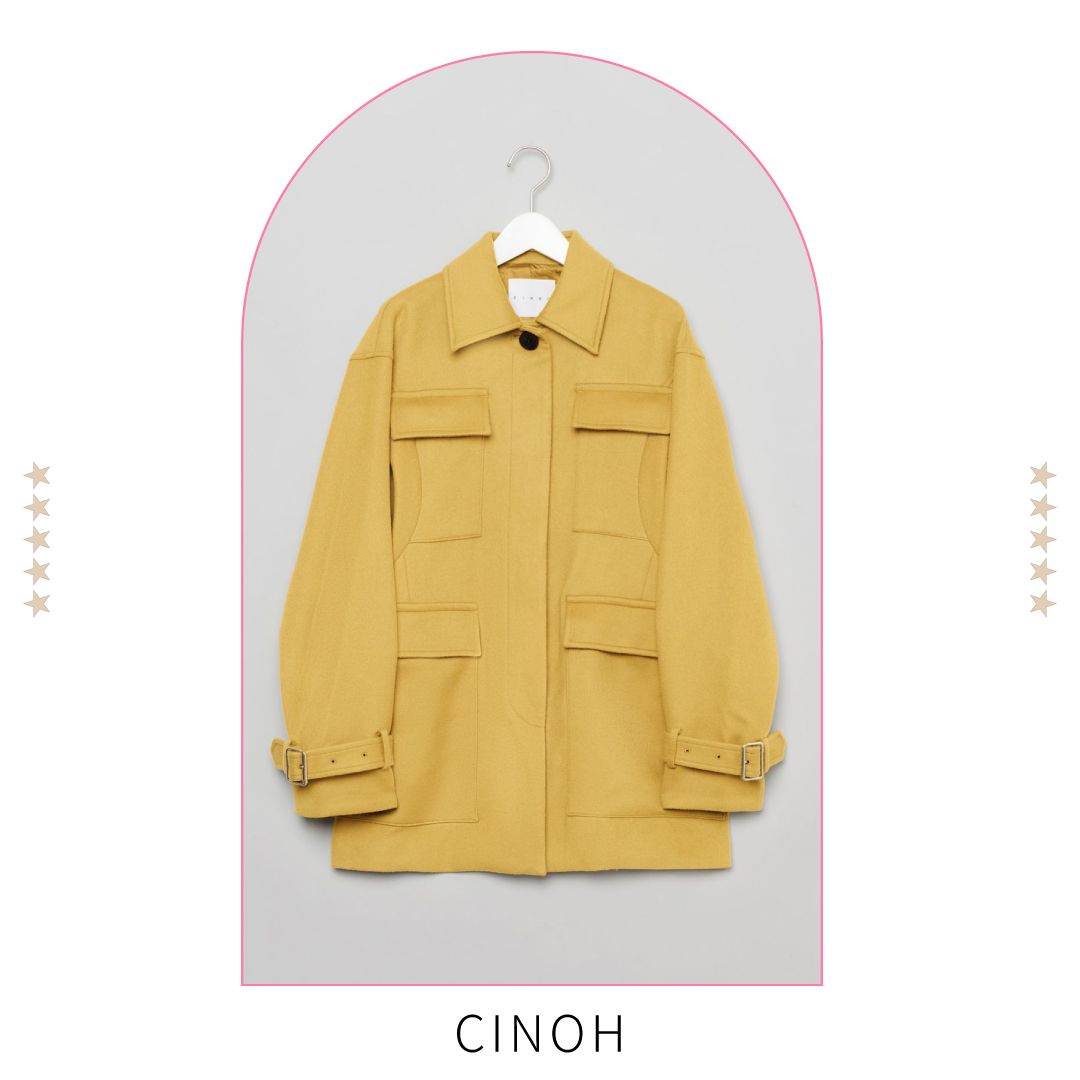 チノ(CINOH)のウールビッグポケットジャケットコートは、鮮やかなマスタードイエローが目を惹く、主役級の1着。ジャケット感覚で羽織れる軽やかさと、冬のお出かけにも安心な高い保温性を兼ね備えています。
