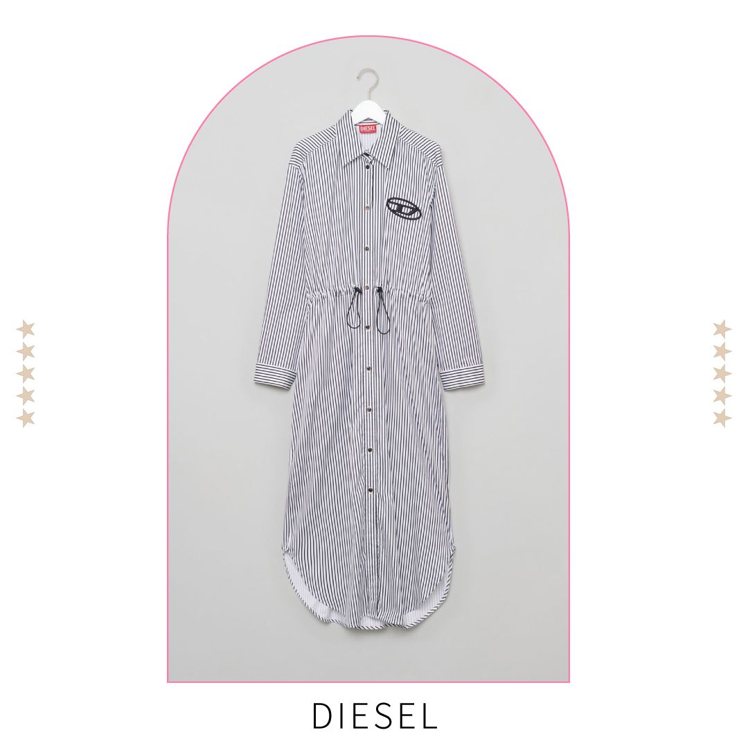 ディーゼル(DIESEL)のドローコードストライプシャツワンピースは、シャープなストライプ柄をベースに、胸元にブランドロゴの「D」があしらわれたエッジの効いたデザイン。ウエスト部分にほどこされたドローコードできゅっと絞れば女性らしく、ゆるめればリラックス感のある着こなしにと、気分やシーンに合わせたアレンジが楽しめます。