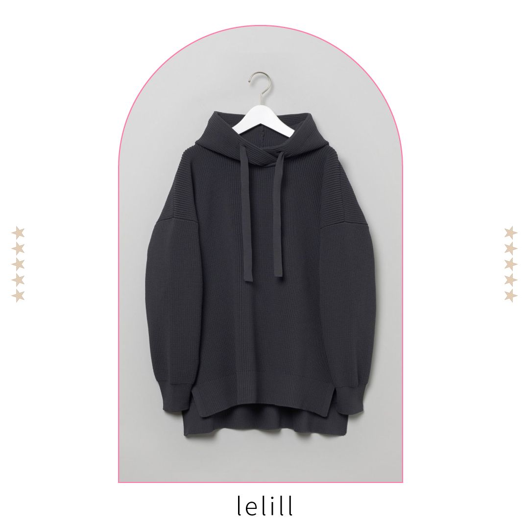 上品なニット地で作られた、レリル(lelill)のミドルゲージリブニットパーカー。ゆとりのあるシルエットと前後差のある裾デザインにより、リラックス感がありながらも野暮ったく見えにくいのが魅力です。
