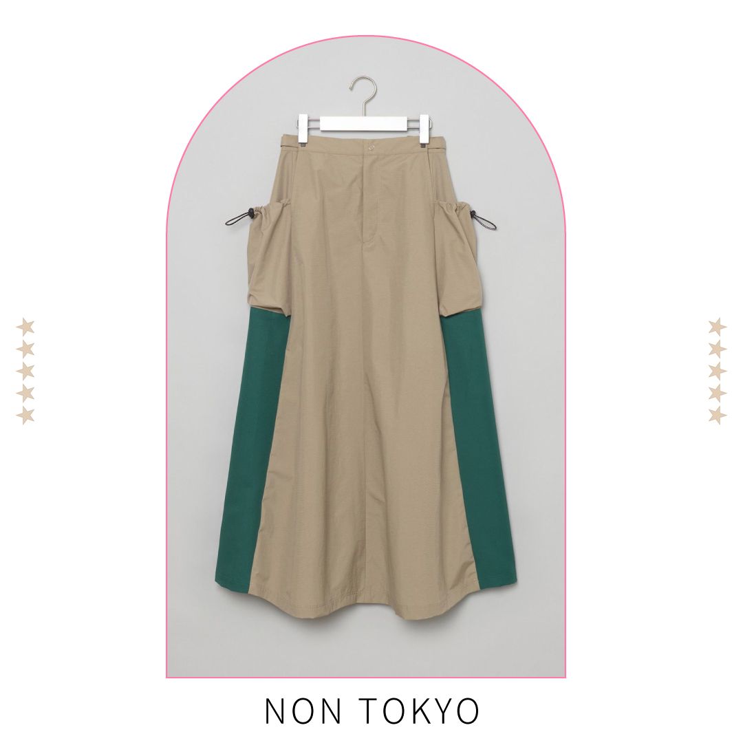 アウトポケットロングスカートは、ノントーキョー(NON TOKYO)らしい遊び心のあるギミックの効いた1着。サイドに配されたグリーンの切り替えと立体的なアウトポケット、バックの異素材のプリーツ切り替えなど、見る角度によって表情が変わるユニークさが魅力です。