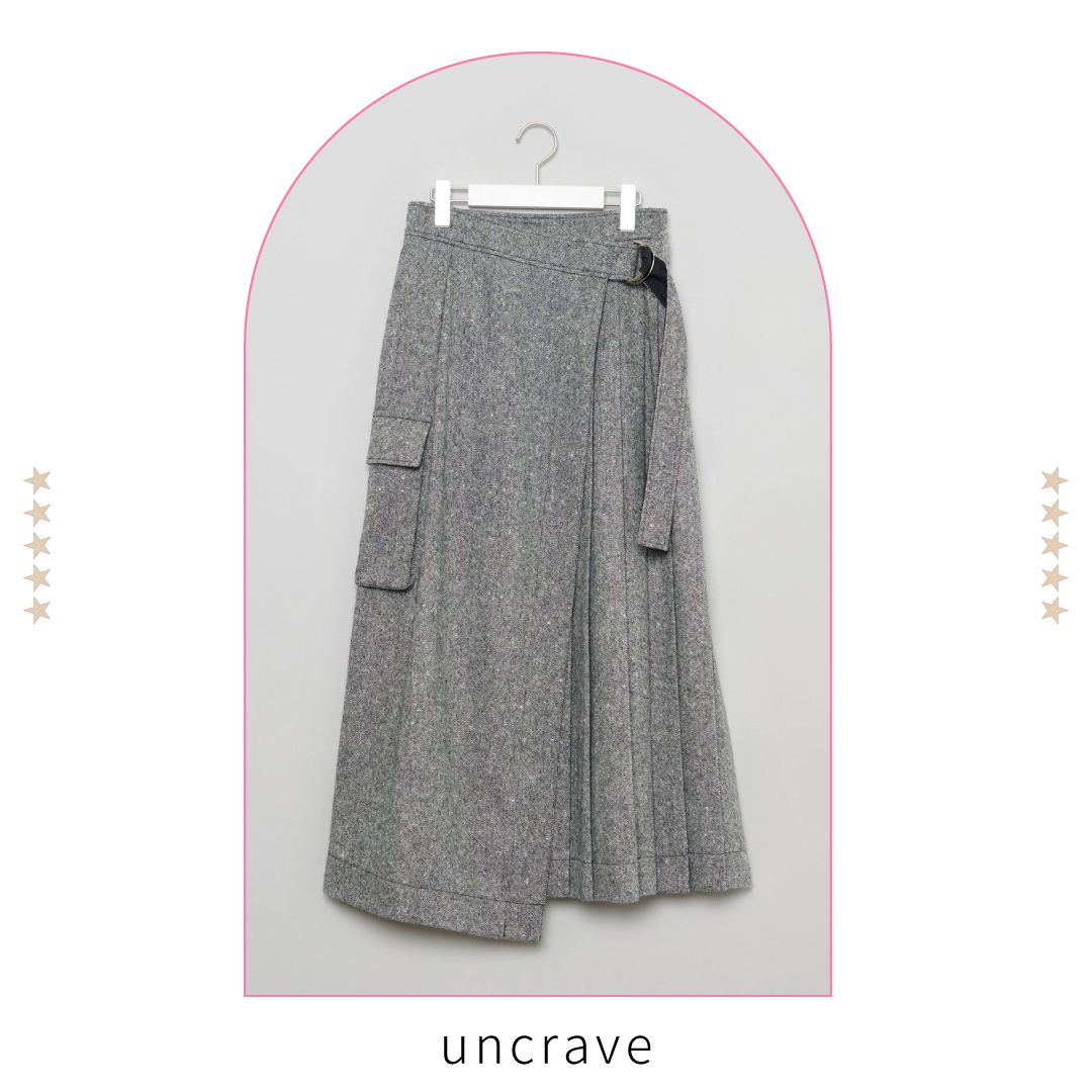 上品さと程よい個性を併せ持つ、アンクレイヴ(uncrave)のネップツイードラッププリーツスカート。表情のあるネップツイード素材を使用し、冬らしい温かみを感じさせながらも、すっきりとしたシルエットで重たく見えないのが◎です。