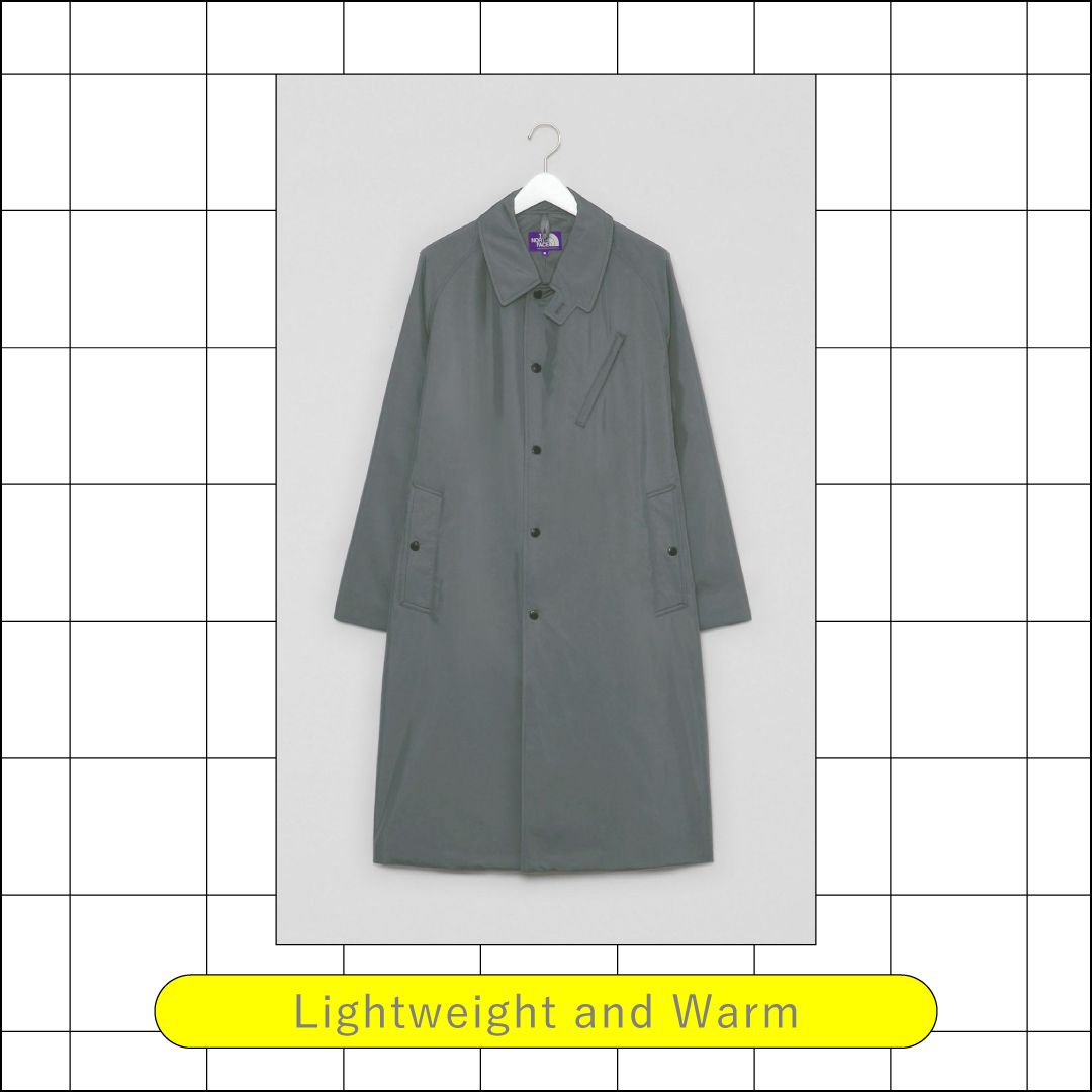 アウトドアブランドの機能性と、都会的で端正なデザインを融合させた、ザ・ノース・フェイス パープルレーベル(THE NORTH FACE PURPLE LABEL)らしいインサレーションコート。保温性と軽量性に優れたプリマロフトを使用し、着膨れしにくいすっきりとしたシルエットが魅力です。上品な光沢感とハリのある素材で、シンプルなステンカラーのデザインが、通勤シーンにも自然となじんでくれます。