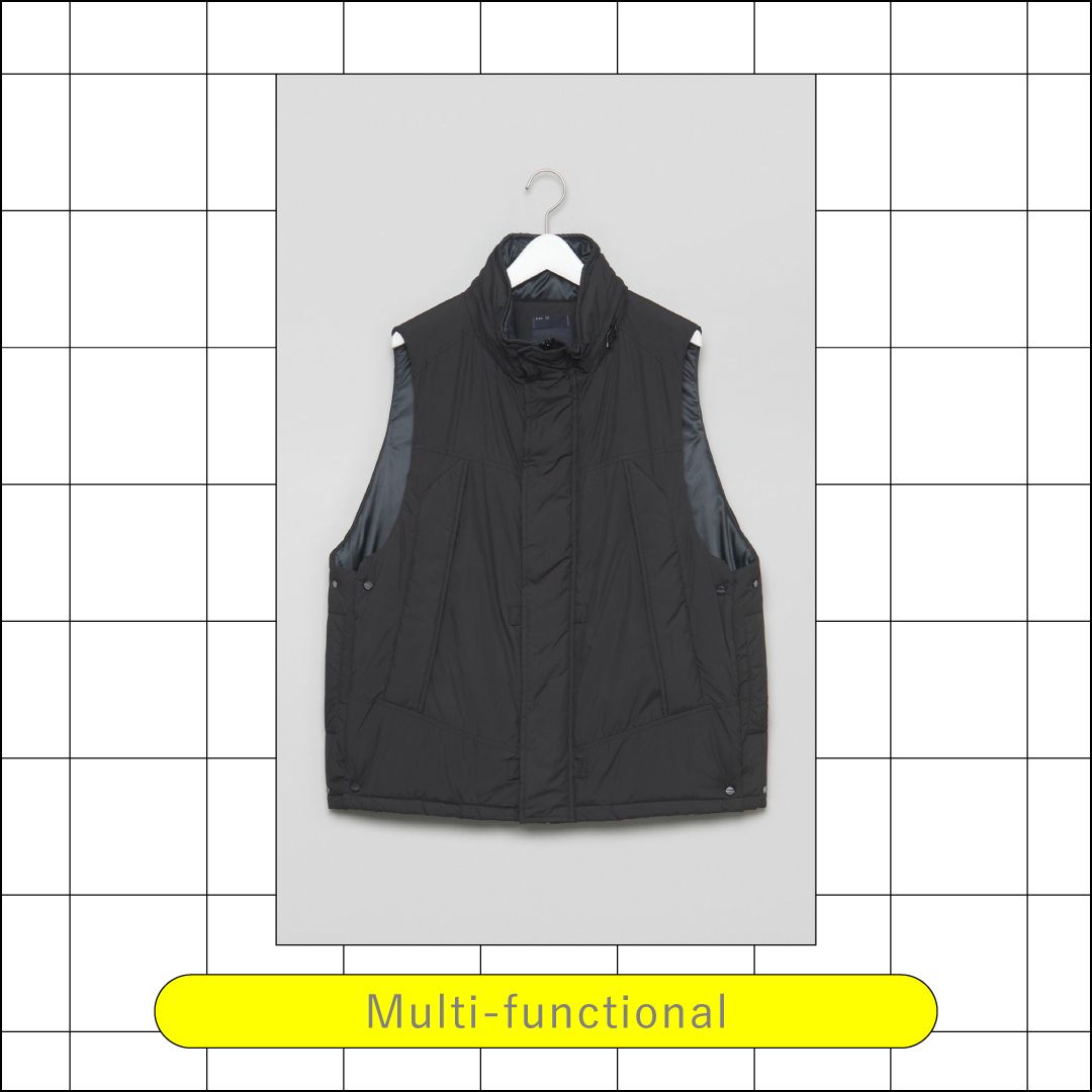 軽量で高い保温性を誇るプリマロフトゴールドと呼ばれる中綿を使用した、ミーンズワイル(meanswhile)のパディングベスト。ダウンのような暖かさを持ちながら、防水性や防風性にも優れています。さらに、大型のファスナー付きポケットにくわえ、脇のスリット内にはハンドウォーマーを採用。内側にもセキュリティポケットやメッシュポケットも備え、バッグいらずの収納量を誇ります。襟元には収納式フードを内蔵しており、シーンや気候に合わせた調整が可能です。スウェットやパーカーとのレイヤードはもちろん、冬はコートの上から重ねた、玄人向けのレイヤードスタイルもおすすめです。