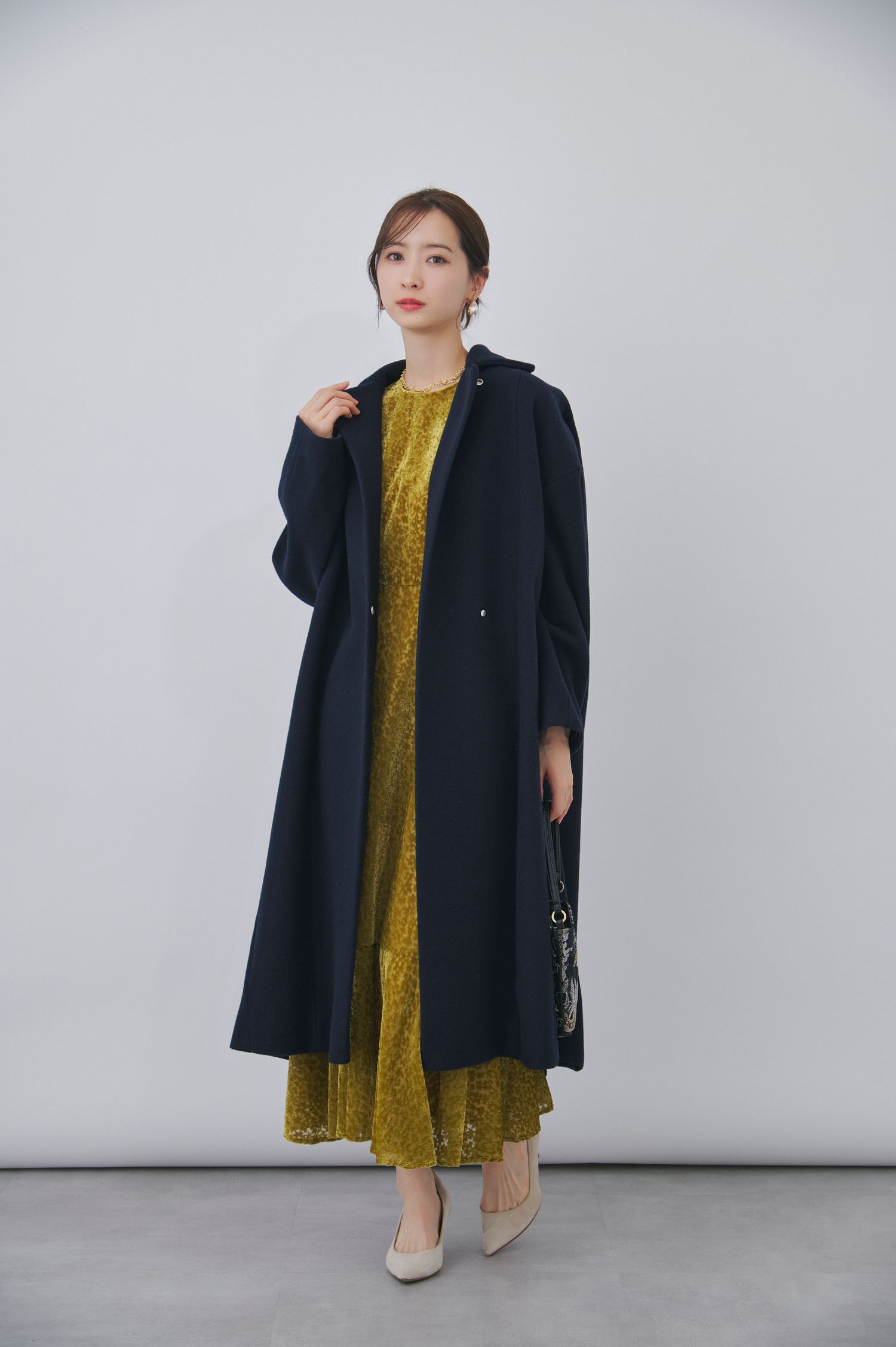 冬らしいベロア調の素材のドレスを主役に、上品な黒コートを合わせたお呼ばれスタイル。華やかな質感とカラーのドレスを選ぶことで、黒のアウターでも重く見えず、きちんと感の中に個性が光ります。シンプルな小物使いで全体を引き算し、大人のお呼ばれにふさわしいバランスに。