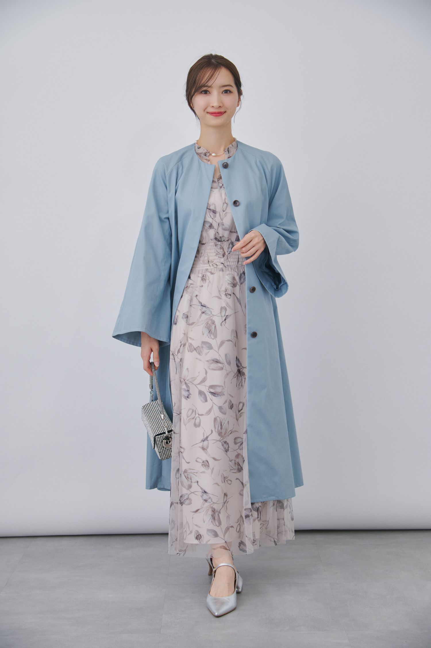 アローブ(Arobe)の別注コートは、裾に向かって軽やかに広がるフレアシルエットと、たっぷりとした生地が生む豊かなギャザーが、結婚式にふさわしい華やかなムードを演出する1着。カラーはパステルブルーを選び、春の陽気に寄り添う軽やかな印象に。ワンピースは、コートのやさしい色味と相性の良い、繊細なタッチの花柄ドレスをセレクト。パステルブルー×パステルピンクのやさしいコントラストが、お祝いの場に上品な華を添えます。