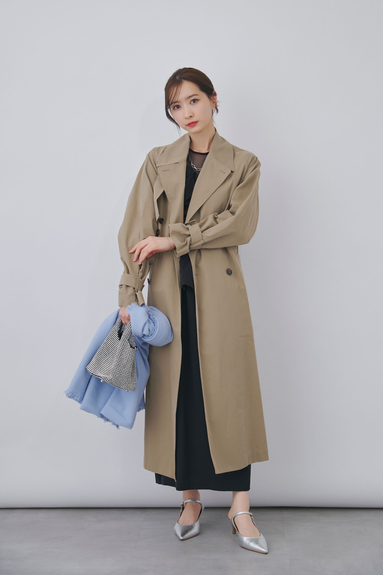 秋の定番アウターであるトレンチコートは、結婚式のお呼ばれシーンにも頼れる存在。スタイリッシュなブラックドレスを合わせることで、甘さを抑えた大人っぽい印象に仕上げました。手元と足元は煌めくシルバーでリンクさせ、華やかさを盛り上げて。