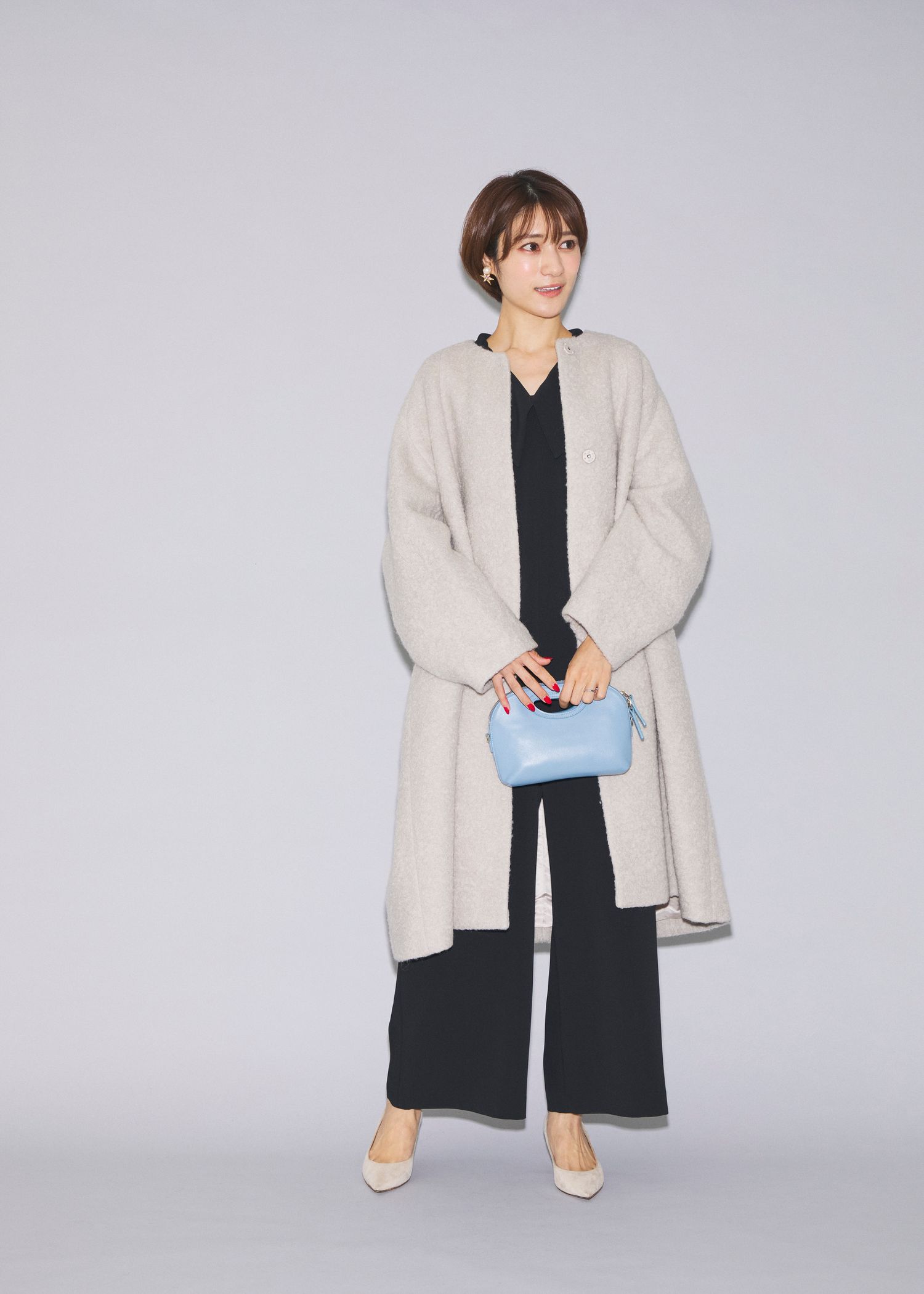 クールな印象が引き立つブラックのオールインワンに、あたたかみのある“モコモコ”素材のノーカラーコートをレイヤード。白を選ぶことで起毛感のあるコートもカジュアルに転ばず、クリーンな印象に仕上がります。装いがモノトーンでシンプルな分、手元にはパステルブルーのクラッチバッグを合わせ、結婚式にふさわしい華やかさをプラス。