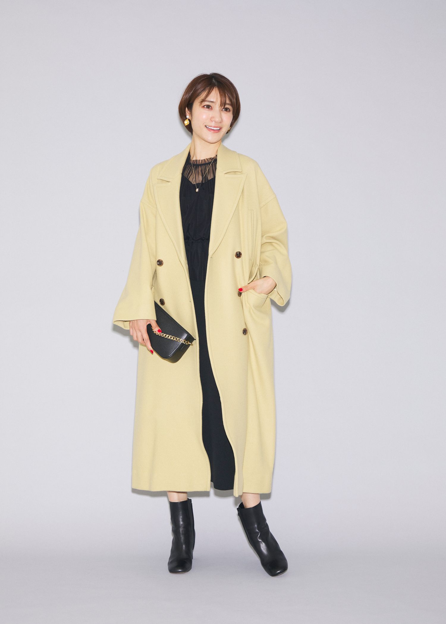 ドレスから小物まで黒でまとめたスタイリングがお好みのモード派におすすめしたいのが、ほんのりやさしさを添えてくれるパステルカラーのテーラードコート。淡い色合いでも直線的なラインが際立つテーラードなら、甘くなりすぎず、スタイリッシュな印象をキープできます。