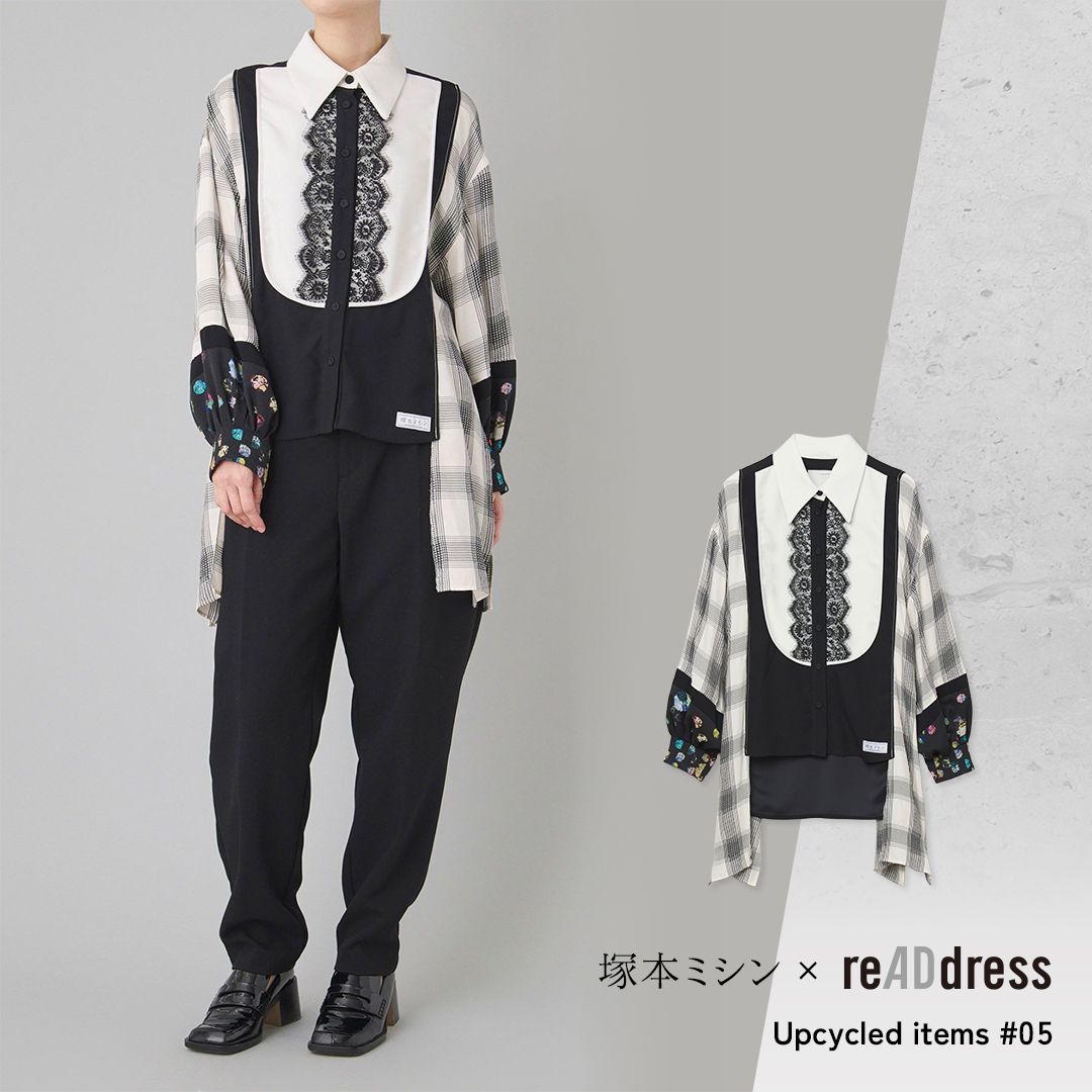 白黒のレースシャツを最初に見たとき、「おしゃれなレースのシャツだな」と感じて、ダメージを落とせば、まだ使えるなと思いました。ただ、真ん中の装飾がかなり強かったので、そこをどう活かすかは結構悩みましたね。いろいろバランスを取りながら組み合わせていった結果、チェック柄を入れてみたり、あえて色や柄を少しごちゃっとさせたりして、ちょっとチカチカするくらいの感じに仕上げてみました。