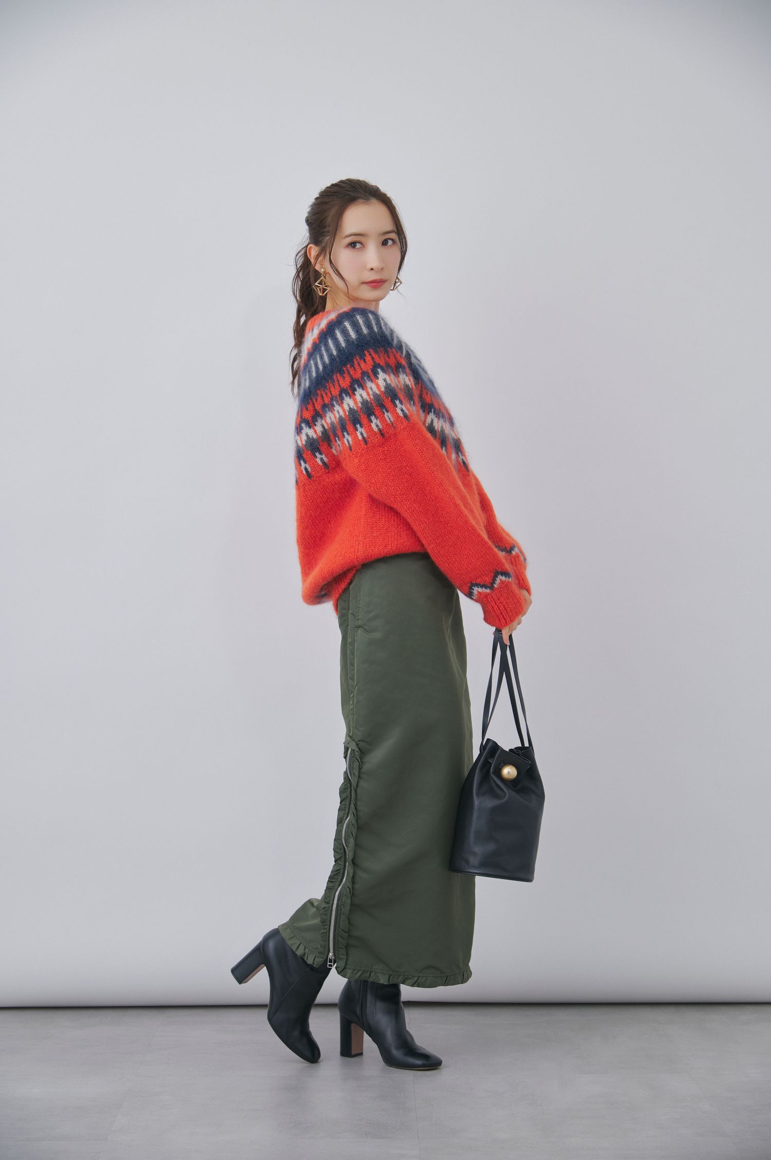 冬コーデがマンネリ化してきた2月の装いには、インパクトのあるセーターを取り入れるのも手。鮮やかなオレンジのノルディック柄セーターなら、着るだけで気分が切り替わり、冬の着こなしに新鮮さをプラスできます。