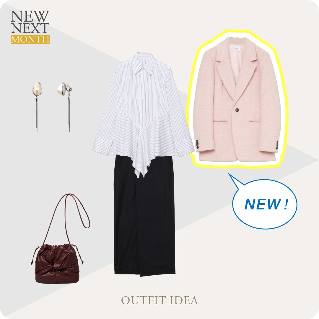 柔らかなベビーピンクのジャケットなら、重くなりがちな冬の通勤スタイルも軽やかな印象に。Iラインスカートを合わせれば、すっきりとしたシルエットが引き立ち、スタイリッシュかつ女性らしいオフィスカジュアルコーデが完成します。