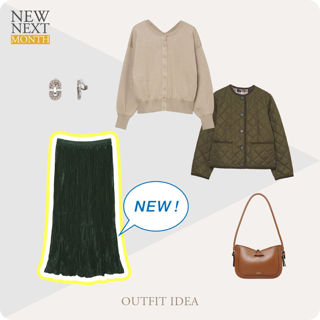 落ち着いたグリーンのプリーツスカートに優しいベージュのニットを合わせれば、オフィスカジュアルコーデに最適な上品スタイルに。きらりと輝くアクセサリーで、新年らしい華やかさも添えて。