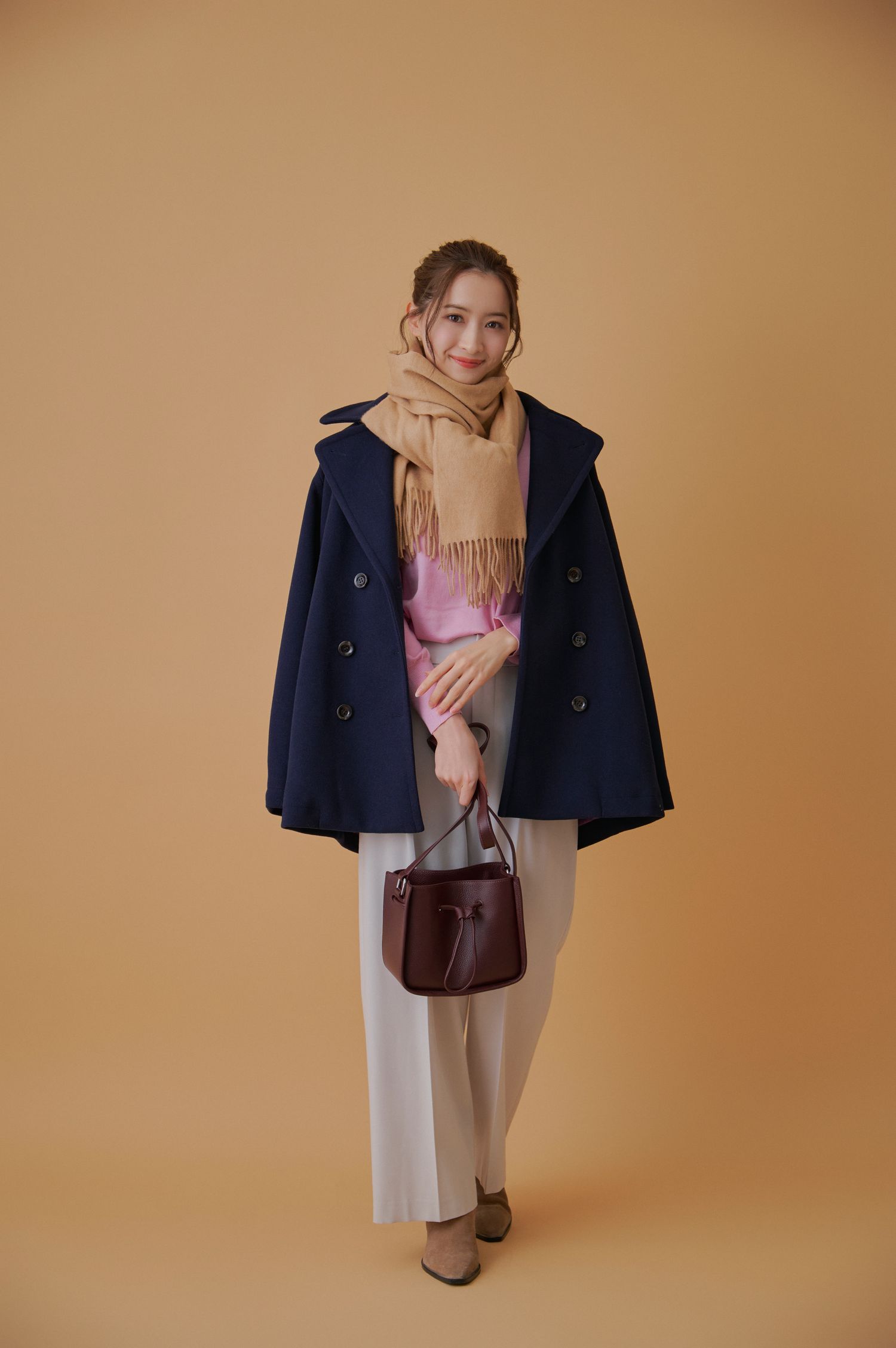 第5位は、柔らかなピンクニットと白パンツに、ネイビーのPコートを羽織った品のある大人カジュアルコーデ。コートを脱げば、やわらかなピンクニットが主役になり、ぐっと親しみやすく明るい印象に。バッグやストールなど小物はブラウンでまとめて、落ち着きのあるエレガントなムードに仕上げました。