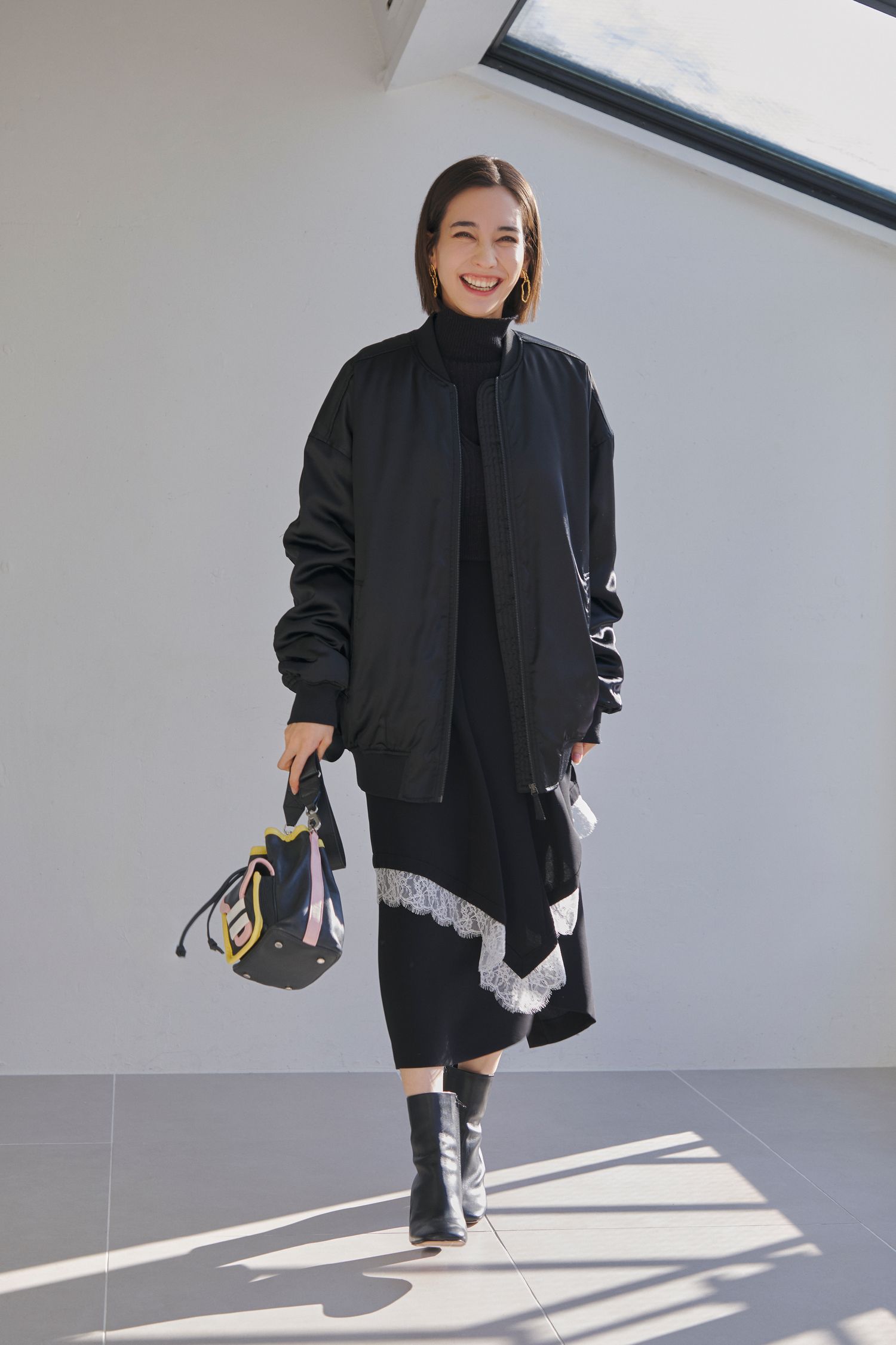 ブラックを基調にしたシックなスタイリングに、さりげない遊び心を効かせた大人のモードコーデ。スカートのレースディテールで重くなりがちなブラックスタイルに抜け感と華やかさをプラスしつつ、ブルゾンで全体をカジュアルダウンして、気負わず着られるバランスに。女性らしさ漂うシャープな着こなしに仕上げました。