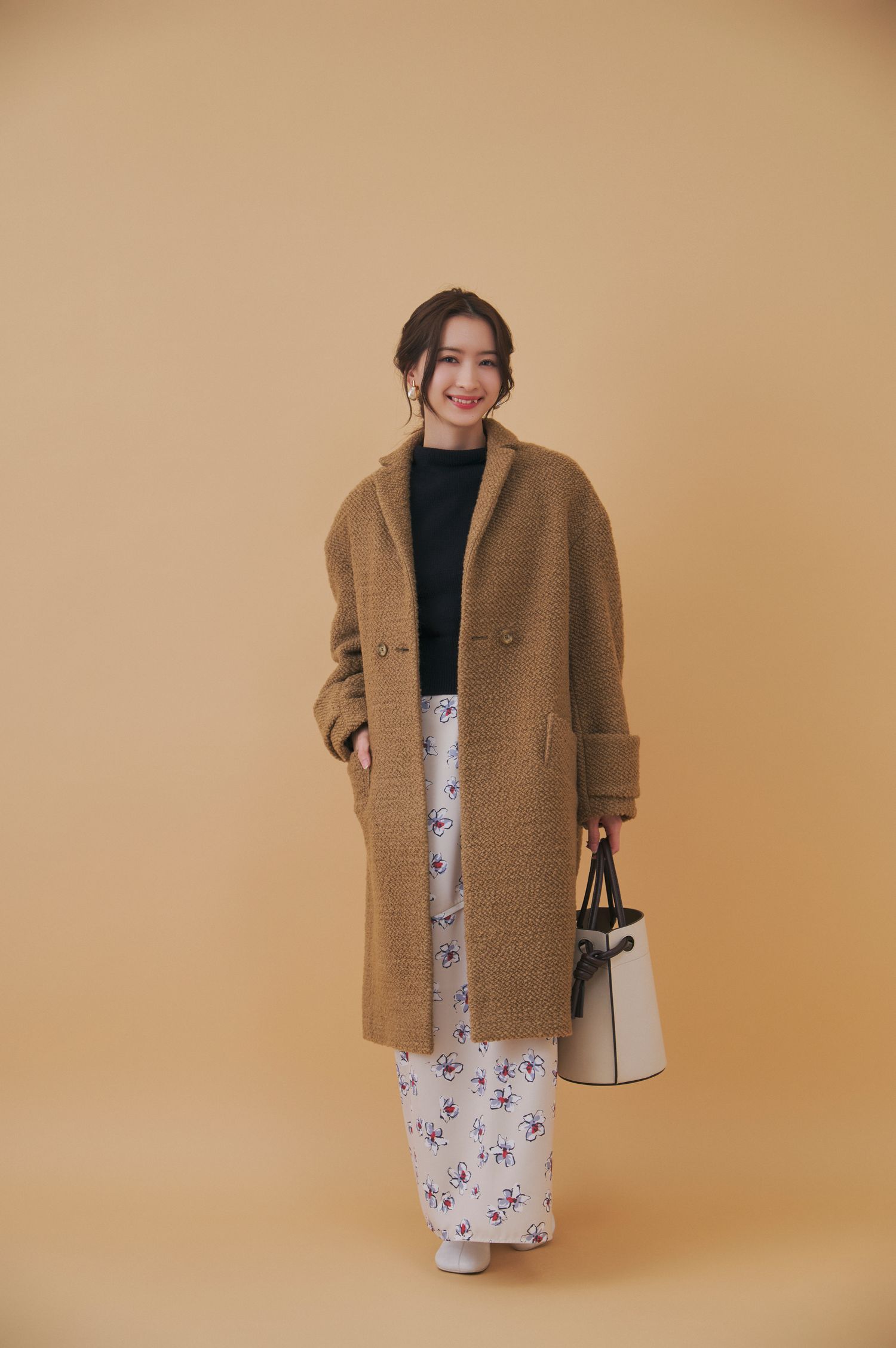 第3位には、ぽこぽことしたプードル調の生地が愛らしいワッフルツイード調のブラウンコートが主役のコーデがランクイン。コートの中は、花柄ワンピースにニットベストをレイヤードして、冬デートにぴったりな大人のフェミニンコーデに。