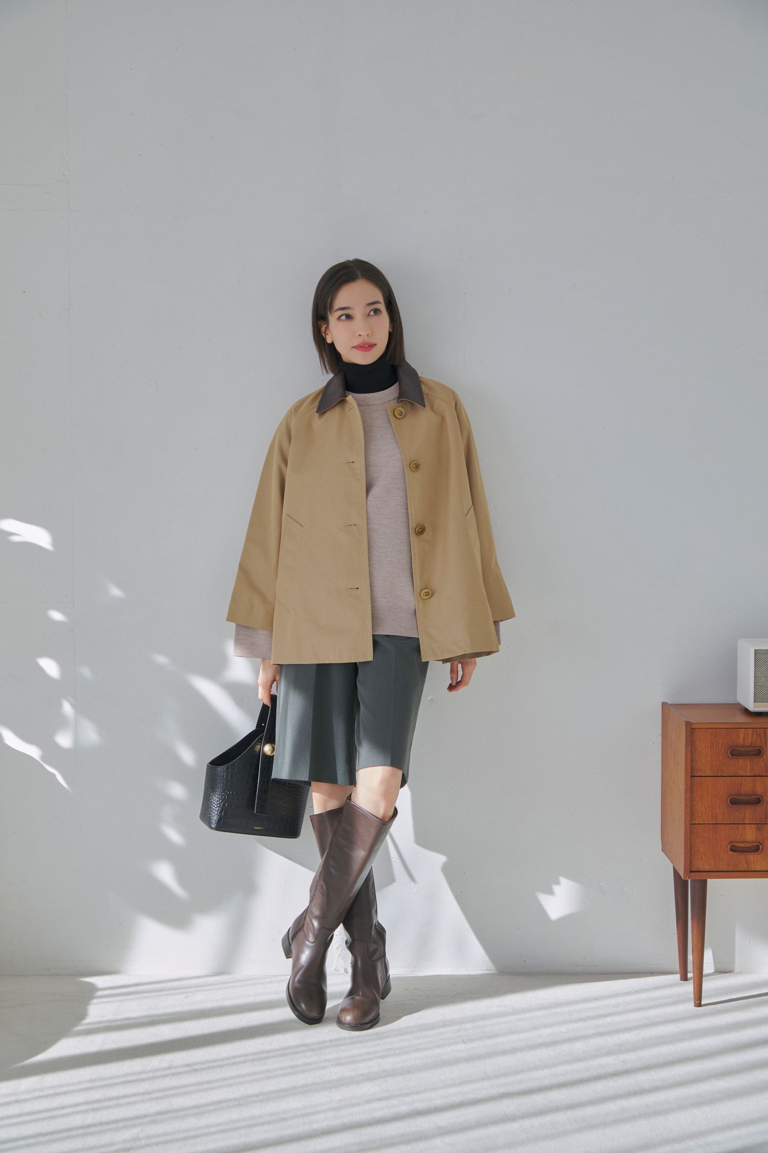今回最も人気を集めたのは、ベージュを基調に、落ち着きと抜け感を両立したコーディネート。ニットのレイヤードにショートコートを羽織って暖かさを確保したら、ボトムスはハーフパンツで程よい抜け感を。ロングブーツ合わせなら、膝周りを肌見せしてこなれ感を演出しつつ、品よくスタイリッシュに仕上がります。