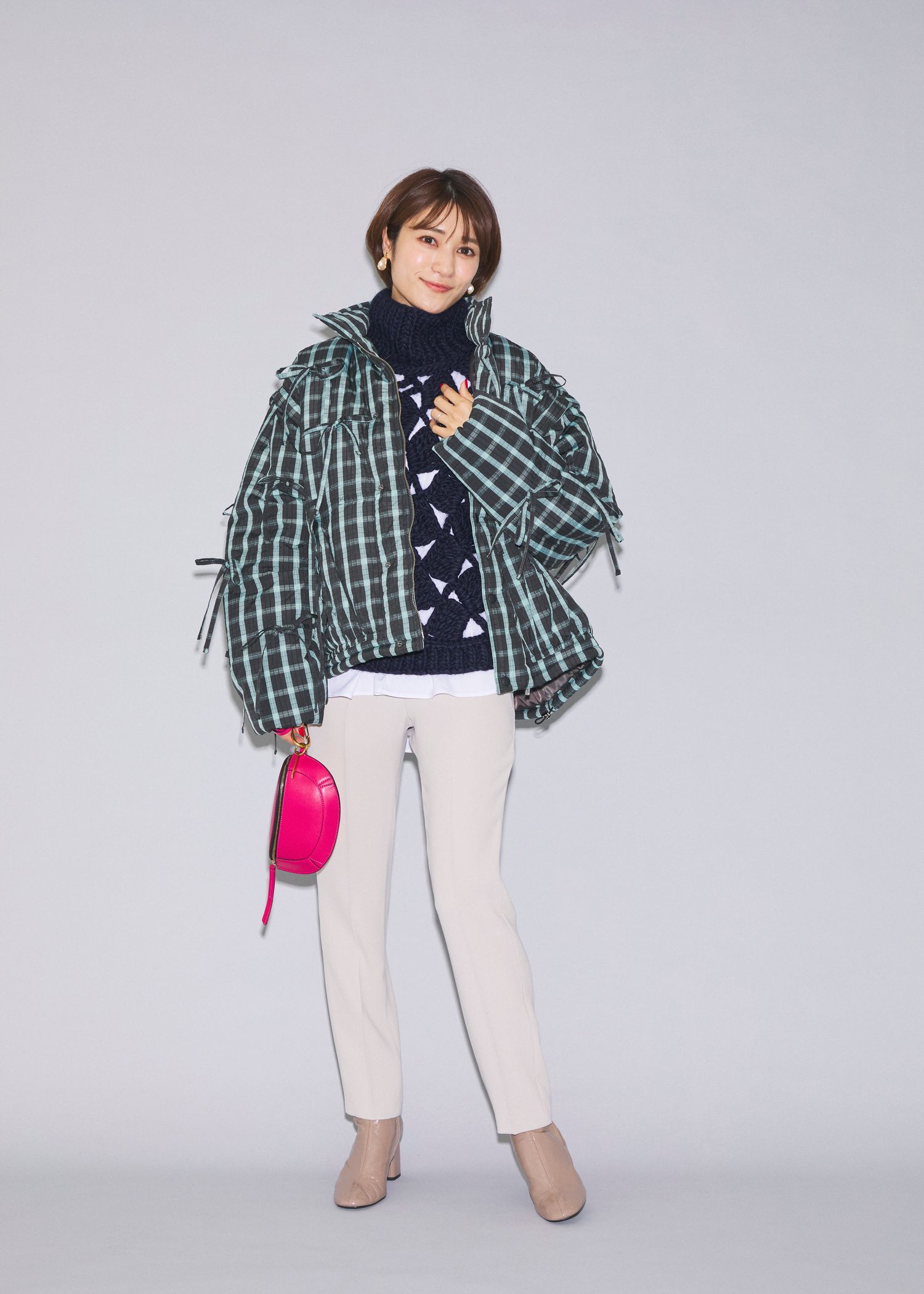 第2位は、チェック柄×リボンディテールが目を引くパファージャケットが主役のカジュアルコーデ。アウターが華やかな分、インナーはネイビーのニットベストと白シャツでシンプルにまとめました。手元にはビビッドピンクのバッグを差して、コーデ全体に華やかなアクセントをプラスして。