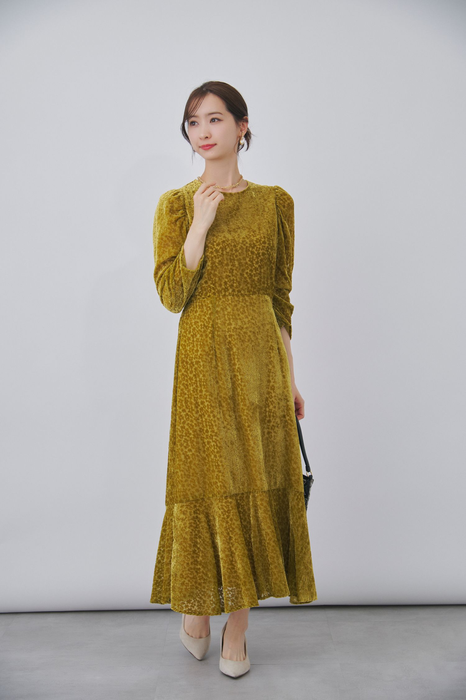 第4位は、深みのあるマスタードカラーが印象的な、上品なワンピースコーデ。一見シンプルな佇まいながら、ベロアならではの起毛感と細やかなフラワー調の柄が重なる、個性が光る1着です。ウエスト位置をやや高めに設定し、そこから緩やかに広がるペプラムシルエットが、自然とスタイルアップを叶えてくれるのもポイント。
