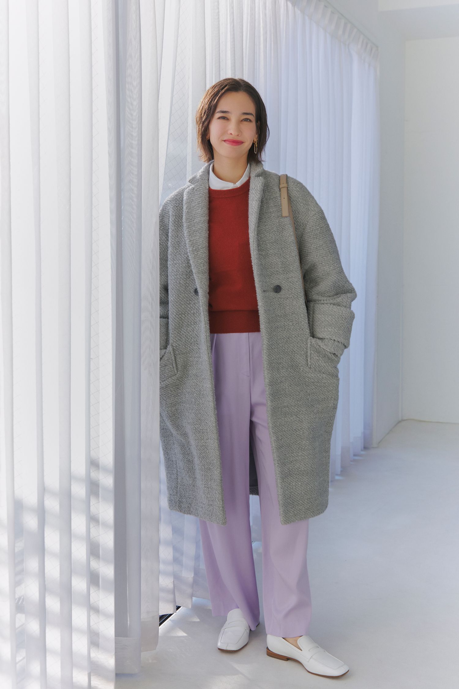 第4位は、やわらかなグレーのコートを主役に、色の重なりで奥行きをつくった、大人のきれいめカジュアルコーデ。インナーには、温かみのあるレッドニットを差し色として効かせ、顔まわりを自然に明るく。そこに淡いラベンダーカラーのパンツを合わせることで、重くなりがちな冬コーデに軽やかさをプラスしています。足元は白のローファーでクリーンにまとめ、きちんと感もさりげなくキープして。