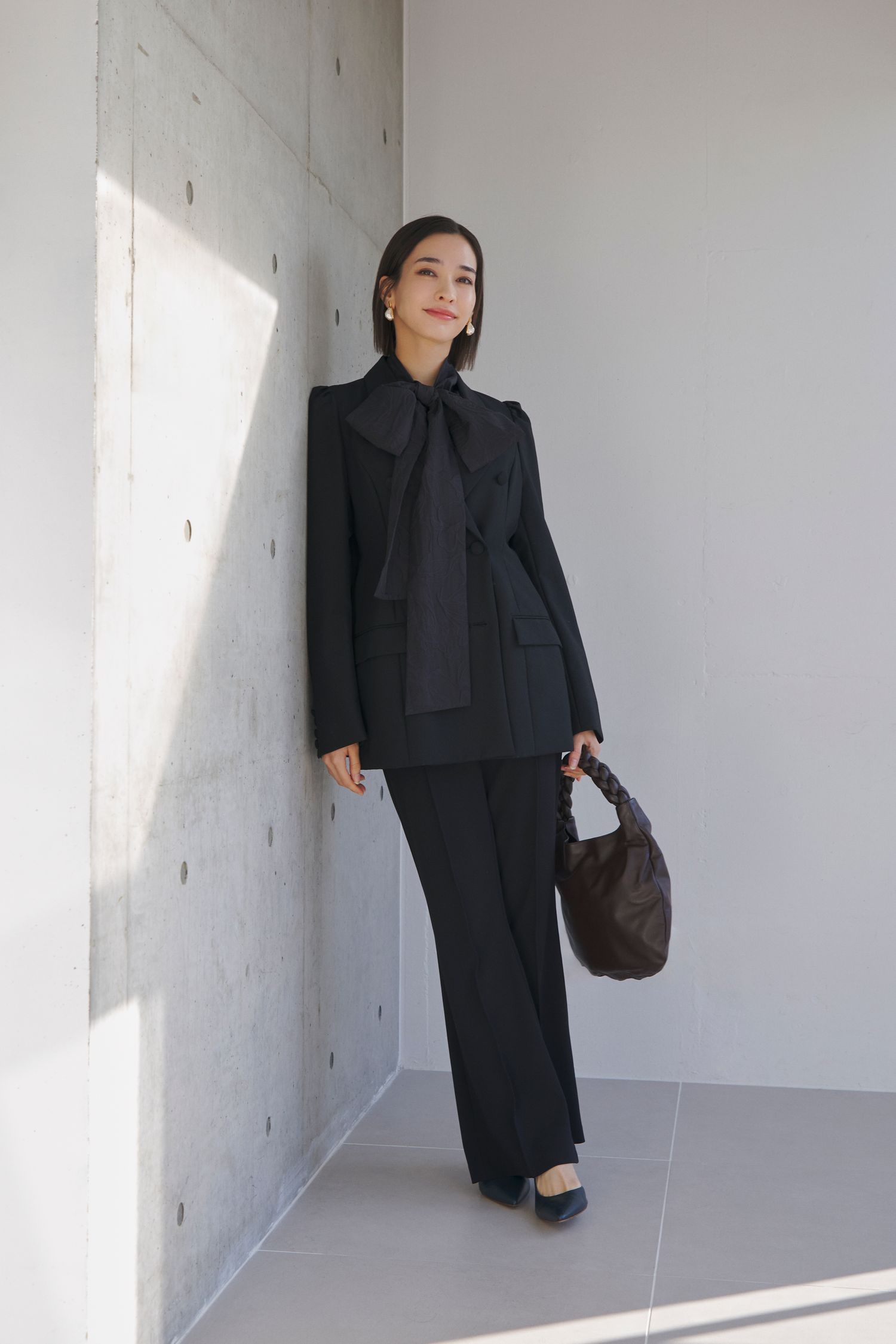 今回最も人気を集めたのは、全身をブラックでまとめた、クラシカルなモードコーデ。かっちりとしたテーラードのフォルムに、柔らかく揺れるボウタイブラウスを合わせることで、端正な中にもさりげない女性らしさが感じられます。