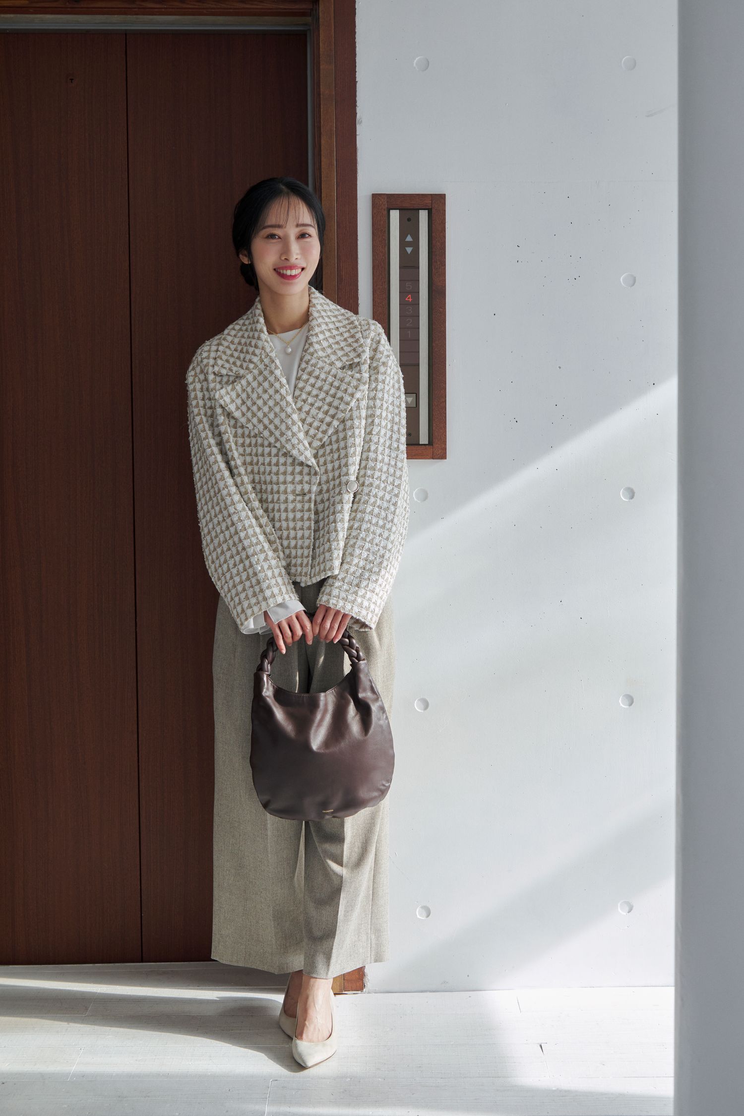 ボトムスには、ハリのあるきれいめなワイドパンツを合わせて、全体をバランスよく調整。足元はポインテッドトゥのパンプスを合わせて、ブラウンのバッグで締めれば、上品さとやわらかさを両立した洗練された着こなしが完成します。