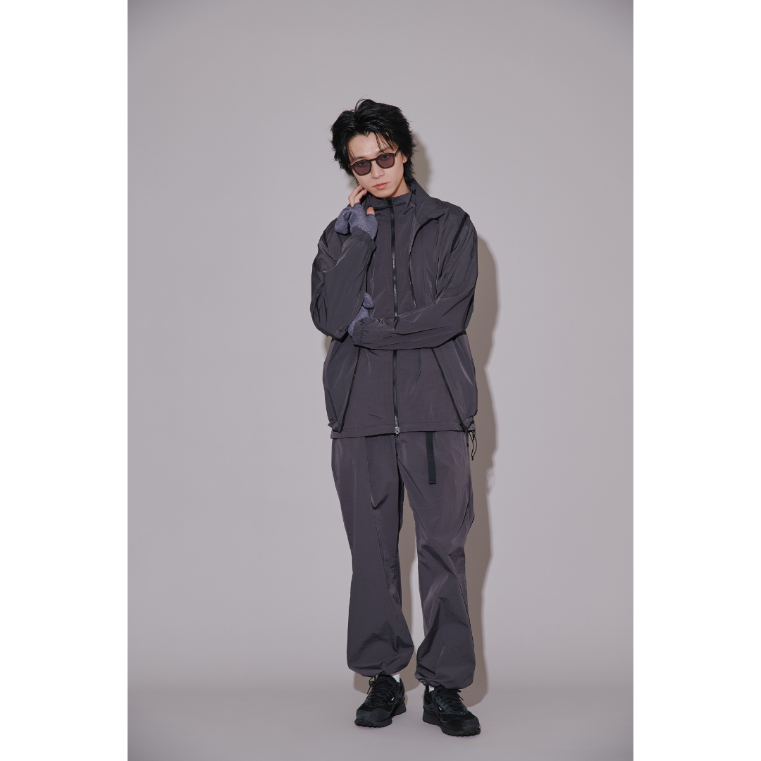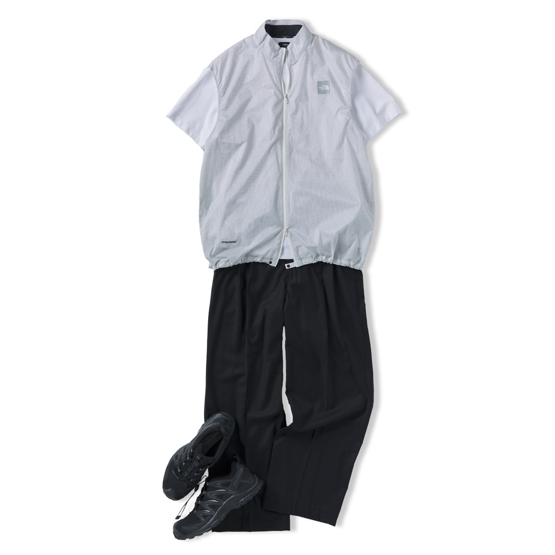 防水性や軽量性に優れた高機能素材を使用したゴールドウィン(Goldwin)のセットアップを主役に、上から同素材のベストをレイヤードした、ゴープコアスタイル。全体をチャコールグレーで統一したシャープな着こなしが、タウンユースにも自然と馴染みます。足元にはトレイル系のスニーカーを合わせつつも、サングラスでこなれ感をプラスすれば、機能性と都会的なバランスが絶妙にマッチした着こなしに。